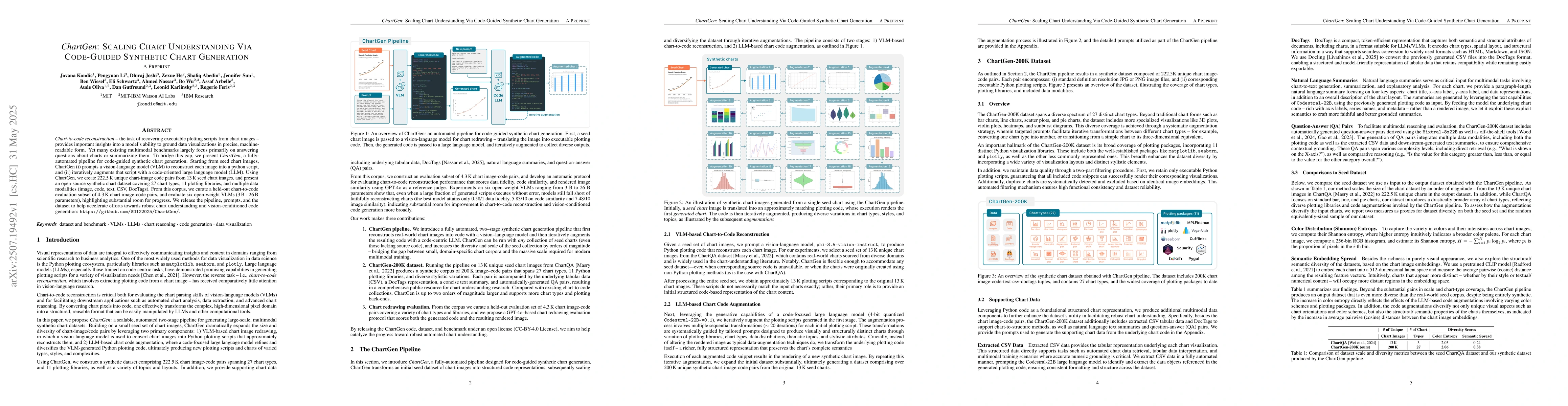 Chart-to-code reconstruction -- the task of recovering executable plotting scripts from chart images -- provides important insights into a model's ability to ground data visualizations in precise, machine-readable form. Yet many existing multimodal benchmarks largely focus primarily on answering questions about charts or summarizing them. To bridge this gap, we present ChartGen, a fully-automated pipeline for code-guided synthetic chart generation. Starting from seed chart images, ChartGen (i) prompts a vision-language model (VLM) to reconstruct each image into a python script, and (ii) iteratively augments that script with a code-oriented large language model (LLM). Using ChartGen, we create 222.5K unique chart-image code pairs from 13K seed chart images, and present an open-source synthetic chart dataset covering 27 chart types, 11 plotting libraries, and multiple data modalities (image, code, text, CSV, DocTags). From this corpus, we curate a held-out chart-to-code evaluation subset of 4.3K chart image-code pairs, and evaluate six open-weight VLMs (3B - 26B parameters), highlighting substantial room for progress. We release the pipeline, prompts, and the dataset to help accelerate efforts towards robust chart understanding and vision-conditioned code generation: https://github.com/SD122025/ChartGen/