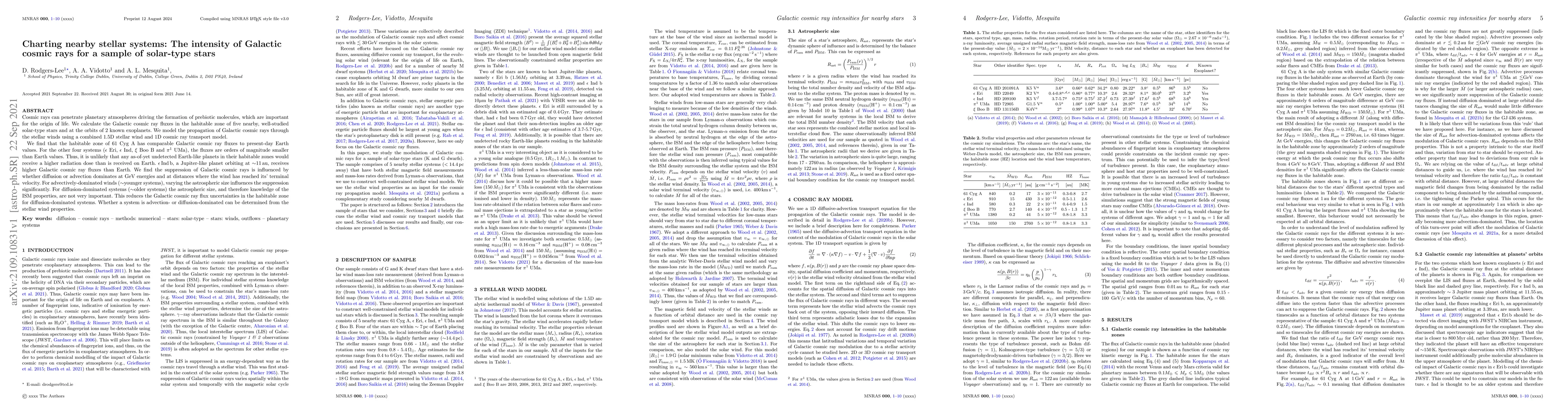 This study calculates Galactic cosmic ray fluxes in the habitable zones of five nearby solar-type stars and near two exoplanets, finding that 61 Cyg A's habitable zone has Earth-like cosmic ray fluxes, while others have significantly lower fluxes. The research uses a 1.5D stellar wind and 1D cosmic ray transport model, revealing that diffusion-dominated systems' flux uncertainties are reduced, and advection-dominated systems' suppression is sensitive to astrospheric size. The Jupiter-like exoplanet ε Ind b receives higher cosmic ray fluxes than Earth.