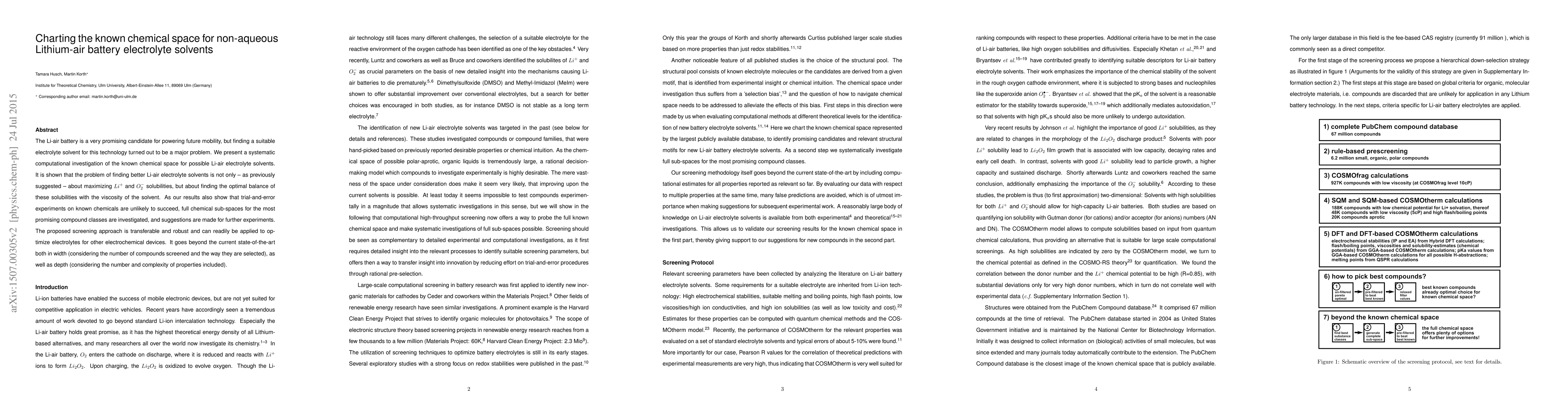 This paper systematically explores the chemical space for non-aqueous electrolyte solvents in Li-Air batteries, revealing that optimal performance depends on balancing Li+ and O2- solubilities with solvent viscosity. The study proposes a robust computational screening approach for identifying promising compounds, surpassing current methods in scope and depth.