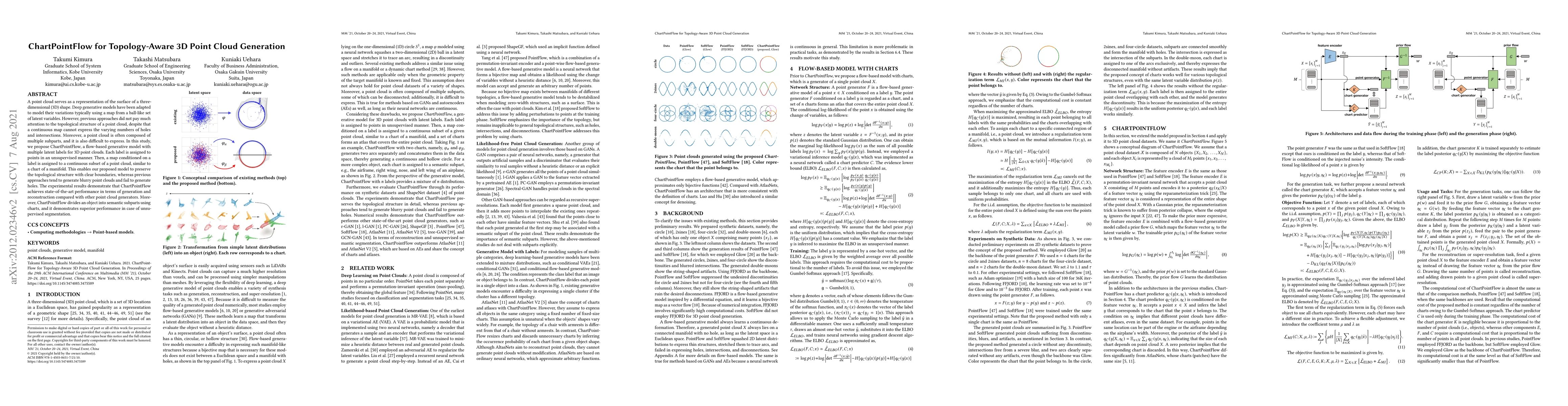 ChartPointFlow introduces a flow-based generative model that leverages multiple latent labels to generate topology-aware 3D point clouds, preserving clear boundaries and accurately representing holes and intersections. Experimental results show superior performance in generation, reconstruction, and unsupervised segmentation compared to previous methods.