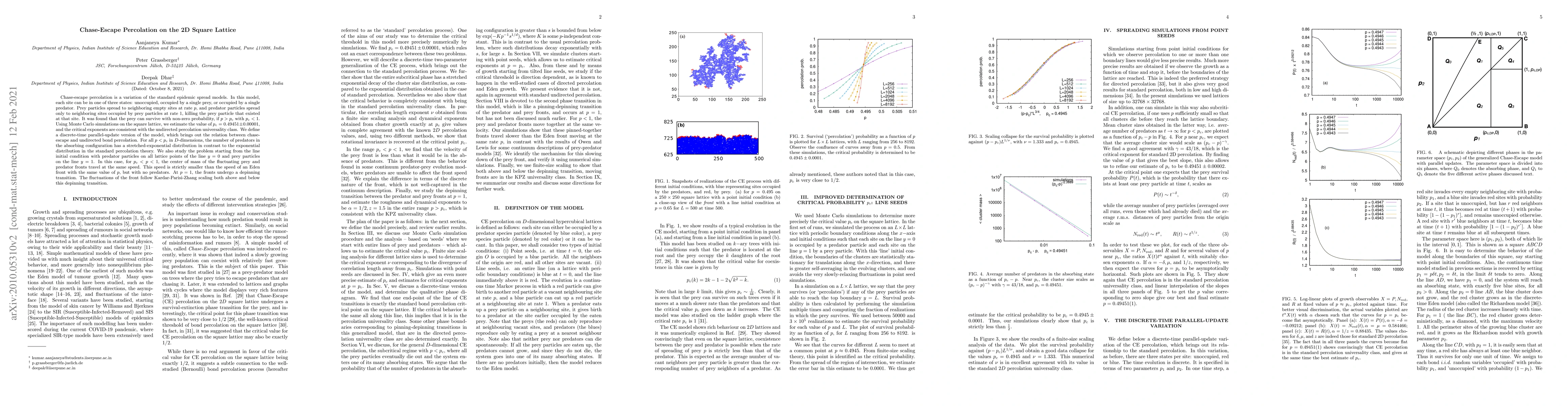 Chase-escape percolation is a variation of the standard epidemic spread models. In this model, each site can be in one of three states: unoccupied, occupied by a single prey, or occupied by a single predator. Prey particles spread to neighboring empty sites at rate $p$, and predator particles spread only to neighboring sites occupied by prey particles at rate $1$, killing the prey particle that existed at that site. It was found that the prey can survive with non-zero probability, if $p>p_c$ with $p_c<1$. Using Monte Carlo simulations on the square lattice, we estimate the value of $p_c = 0.49451 \pm 0.00001$, and the critical exponents are consistent with the undirected percolation universality class. We define a discrete-time parallel-update version of the model, which brings out the relation between chase-escape and undirected bond percolation. For all $p < p_c$ in $D$-dimensions, the number of predators in the absorbing configuration has a stretched-exponential distribution in contrast to the exponential distribution in the standard percolation theory. We also study the problem starting from the line initial condition with predator particles on all lattice points of the line $y=0$ and prey particles on the line $y=1$. In this case, for $p_c
