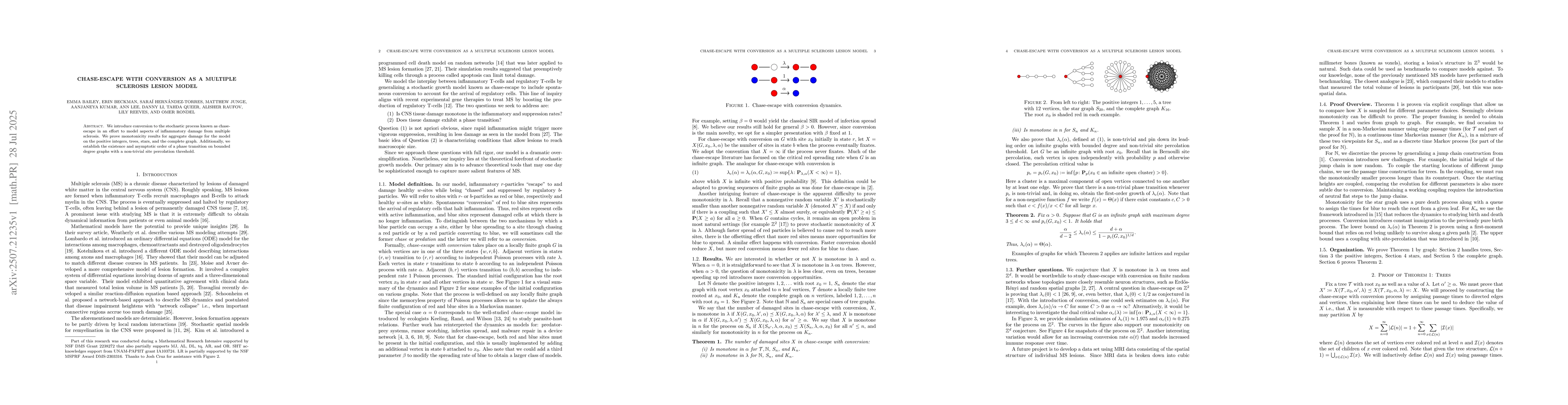 We introduce conversion to the stochastic process known as chase-escape in an effort to model aspects of inflammatory damage from multiple sclerosis. We prove monotonicity results for aggregate damage for the model on the positive integers, trees, stars, and the complete graph. Additionally, we establish the existence and asymptotic order of a phase transition on bounded degree graphs with a non-trivial site percolation threshold.