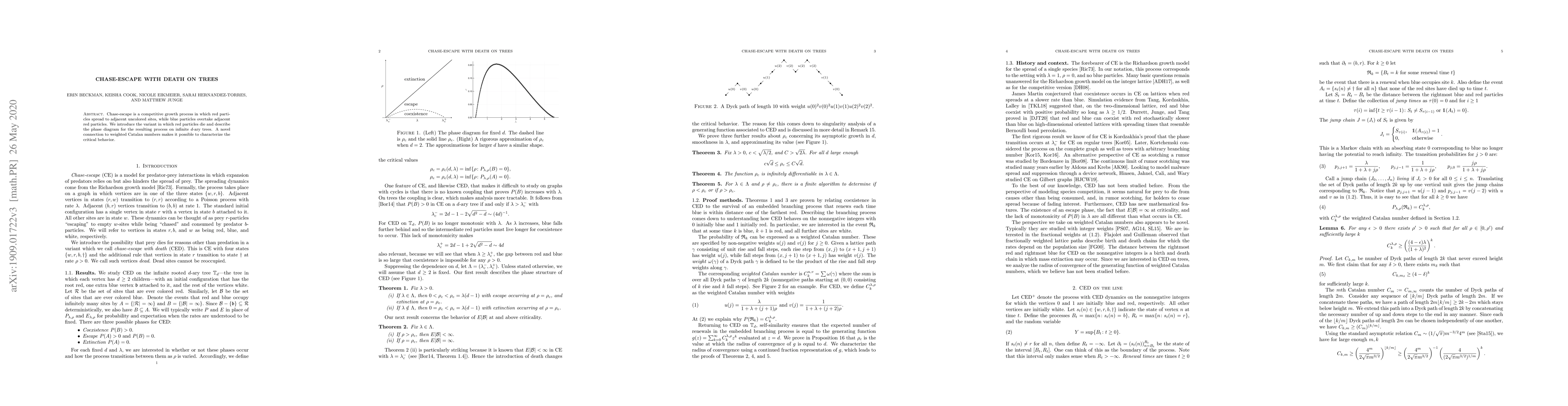 Researchers introduce a new variant of chase-escape on infinite d-ary trees, where red particles die, and show how it relates to weighted Catalan numbers, enabling the characterization of critical behavior.