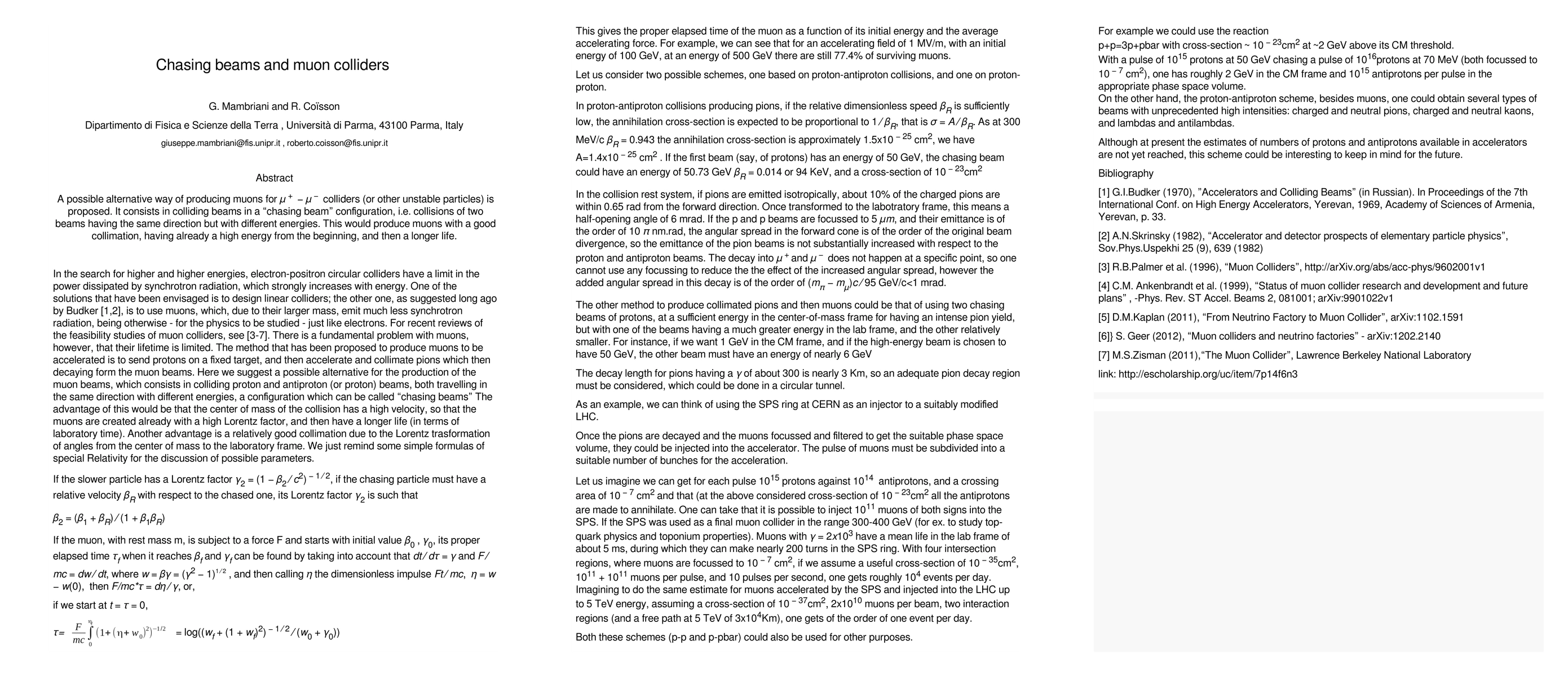 Summary: This paper proposes a novel "chasing beam" method for producing muons for colliders, involving the collision of two beams with the same direction but different energies, which aims to achieve better collimation, higher initial energy, and longer muon lifetime.