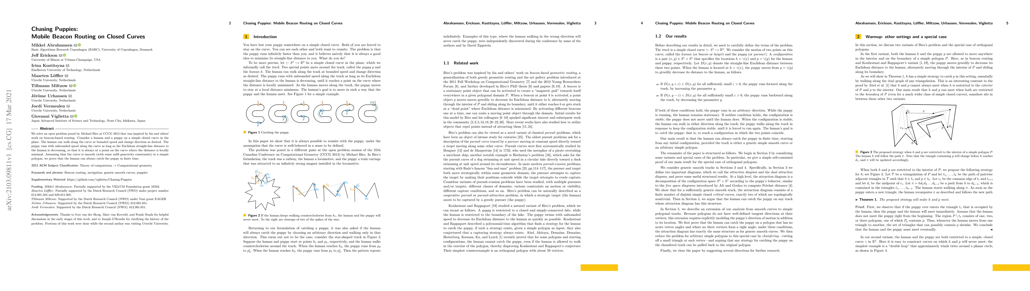 This paper solves a problem about a human catching a puppy on a closed curve. Using smooth curve assumptions or simple polygon geometry, it proves the human can always catch the puppy in finite time, as the puppy constantly moves towards the nearest point on the curve.