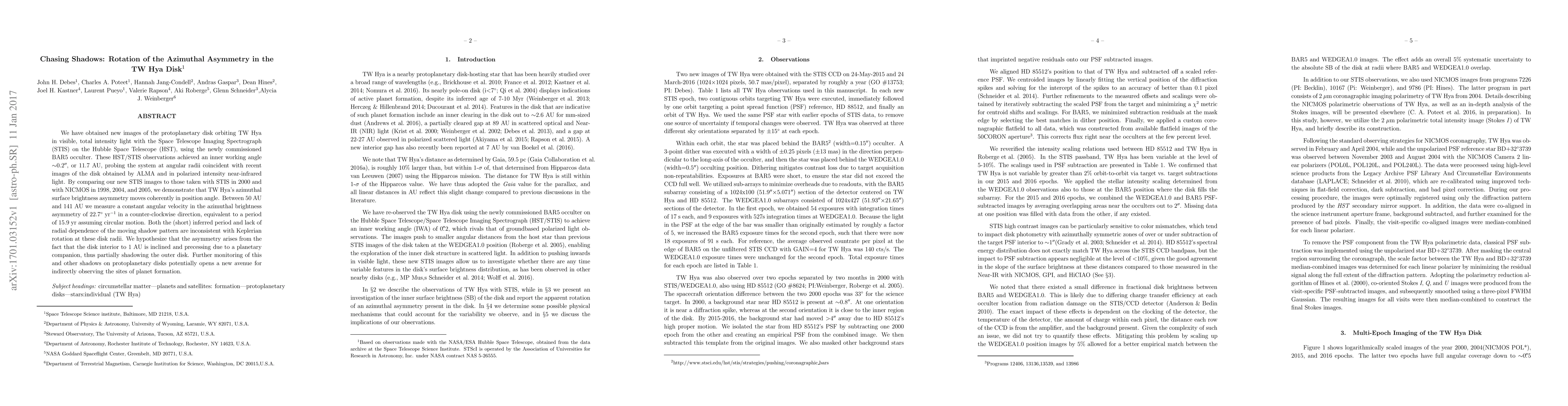 We have obtained new images of the protoplanetary disk orbiting TW Hya in visible, total intensity light with the Space Telescope Imaging Spectrograph (STIS) on the Hubble Space Telescope (HST), using the newly commissioned BAR5 occulter. These HST/STIS observations achieved an inner working angle $\sim$0.2\arcsec, or 11.7~AU, probing the system at angular radii coincident with recent images of the disk obtained by ALMA and in polarized intensity near-infrared light. By comparing our new STIS images to those taken with STIS in 2000 and with NICMOS in 1998, 2004, and 2005, we demonstrate that TW Hya's azimuthal surface brightness asymmetry moves coherently in position angle. Between 50~AU and 141~AU we measure a constant angular velocity in the azimuthal brightness asymmetry of 22.7$^\circ$~yr$^{-1}$ in a counter-clockwise direction, equivalent to a period of 15.9~yr assuming circular motion. Both the (short) inferred period and lack of radial dependence of the moving shadow pattern are inconsistent with Keplerian rotation at these disk radii. We hypothesize that the asymmetry arises from the fact that the disk interior to 1~AU is inclined and precessing due to a planetary companion, thus partially shadowing the outer disk. Further monitoring of this and other shadows on protoplanetary disks potentially opens a new avenue for indirectly observing the sites of planet formation.