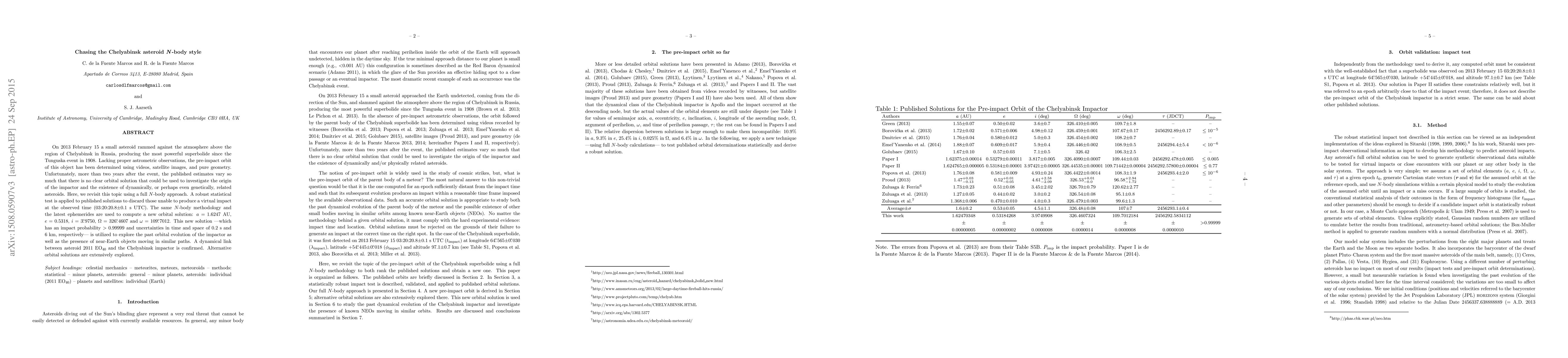 On 2013 February 15 a small asteroid rammed against the atmosphere above the region of Chelyabinsk in Russia, producing the most powerful superbolide since the Tunguska event in 1908. Lacking proper astrometric observations, the pre-impact orbit of this object has been determined using videos, satellite images, and pure geometry. Unfortunately, more than two years after the event, the published estimates vary so much that there is no clear orbital solution that could be used to investigate the origin of the impactor and the existence of dynamically, or perhaps even genetically, related asteroids. Here, we revisit this topic using a full N-body approach. A robust statistical test is applied to published solutions to discard those unable to produce a virtual impact at the observed time (03:20:20.8 s UTC). The same N-body methodology and the latest ephemerides are used to compute a new orbital solution: a=1.6247 AU, e=0.5318, i=3.9750 degrees, Omega=326.4607 degrees and omega=109.7012 degrees. This new solution --which has an impact probability > 0.99999 and uncertainties in time and space of 0.2 s and 6 km, respectively-- is utilized to explore the past orbital evolution of the impactor as well as the presence of near-Earth objects moving in similar paths. A dynamical link between asteroid 2011 EO40 and the Chelyabinsk impactor is confirmed. Alternative orbital solutions are extensively explored.