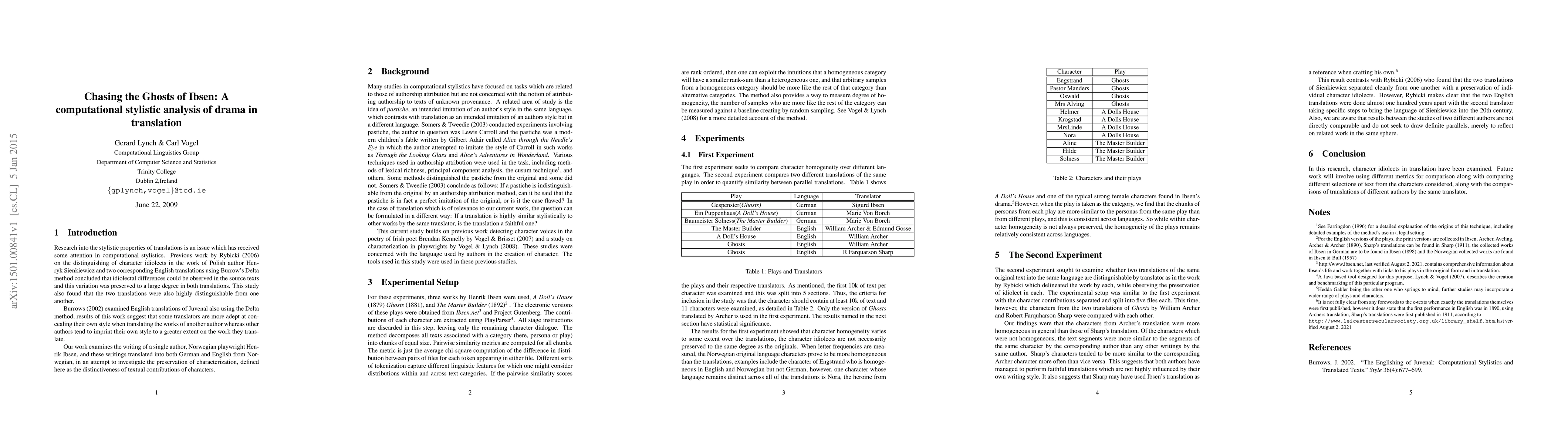 Research into the stylistic properties of translations is an issue which has received some attention in computational stylistics. Previous work by Rybicki (2006) on the distinguishing of character idiolects in the work of Polish author Henryk Sienkiewicz and two corresponding English translations using Burrow's Delta method concluded that idiolectal differences could be observed in the source texts and this variation was preserved to a large degree in both translations. This study also found that the two translations were also highly distinguishable from one another. Burrows (2002) examined English translations of Juvenal also using the Delta method, results of this work suggest that some translators are more adept at concealing their own style when translating the works of another author whereas other authors tend to imprint their own style to a greater extent on the work they translate. Our work examines the writing of a single author, Norwegian playwright Henrik Ibsen, and these writings translated into both German and English from Norwegian, in an attempt to investigate the preservation of characterization, defined here as the distinctiveness of textual contributions of characters.