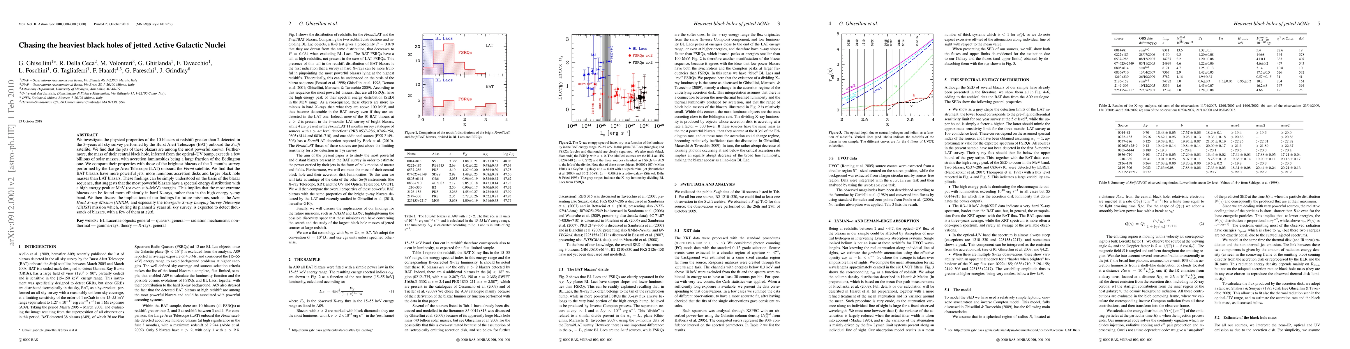 We investigate the physical properties of the 10 blazars at redshift greater than 2 detected in the 3-years all sky survey performed by the Burst Alert Telescope (BAT) onboard the Swift satellite. We find that the jets of these blazars are among the most powerful known. Furthermore, the mass of their central black hole, inferred from the optical-UV bump, exceeds a few billions of solar masses, with accretion luminosities being a large fraction of the Eddington one. We compare their properties with those of the brightest blazars of the 3-months survey performed by the Large Area Telescope (LAT) onboard the Fermi satellite. We find that the BAT blazars have more powerful jets, more luminous accretion disks and larger black hole masses than LAT blazars. These findings can be simply understood on the basis of the blazar sequence, that suggests that the most powerful blazars have a spectral energy distribution with a high energy peak at MeV (or even sub-MeV) energies. This implies that the most extreme blazars can be found more efficiently in hard X-rays, rather than in the high energy gamma-ray band. We then discuss the implications of our findings for future missions, such as the New Hard X-ray Mission (NHXM) and especially the Energetic X-ray Imaging Survey Telescope (EXIST) mission which, during its planned 2 years all sky survey, is expected to detect thousands of blazars, with a few of them at z greater than 6.