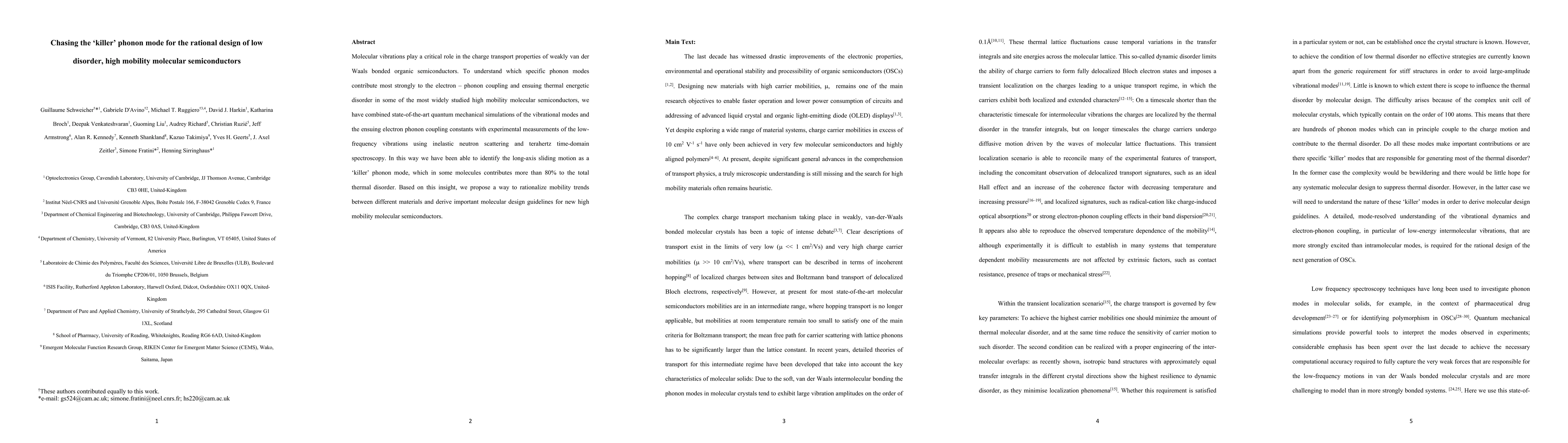 This paper identifies the long-axis sliding motion as a dominant "killer phonon mode" contributing over 80% to thermal disorder in high mobility molecular semiconductors, using quantum simulations and experimental techniques. The findings suggest guidelines for designing new materials with improved charge transport properties.