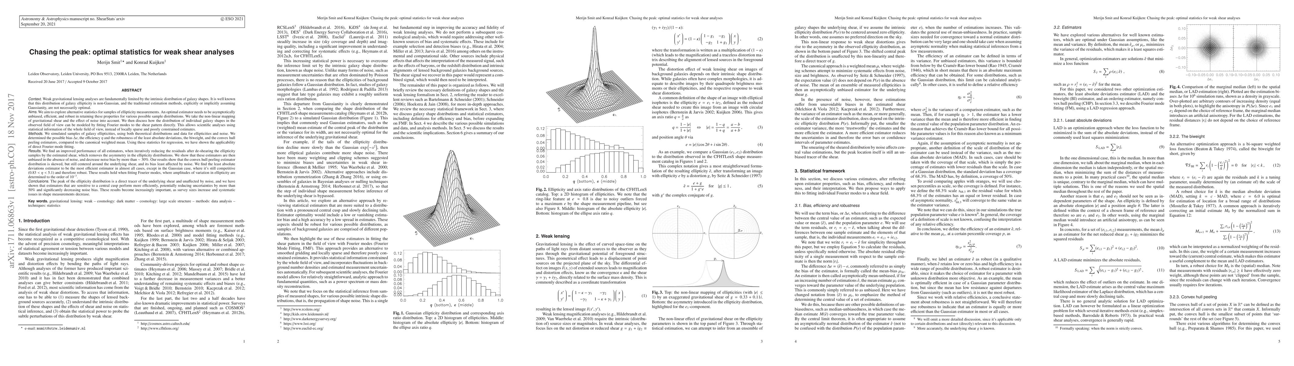 Weak gravitational lensing analyses are fundamentally limited by the intrinsic, non-Gaussian distribution of galaxy shapes. We explore alternative statistics for samples of ellipticity measurements that are unbiased, efficient, and robust. We take the non-linear mapping of gravitational shear and the effect of noise into account. We then discuss how the distribution of individual galaxy shapes in the observed field of view can be modeled by fitting Fourier modes to the shear pattern directly. We simulated samples of galaxy ellipticities, using both theoretical distributions and real data for ellipticities and noise. We determined the possible bias $\Delta e$, the efficiency $\eta$ and the robustness of the least absolute deviations, the biweight, and the convex hull peeling estimators, compared to the canonical weighted mean. Using these statistics for regression, we have shown the applicability of direct Fourier mode fitting. These estimators can be unbiased in the absence of noise, and decrease noise bias by more than $\sim 30\%$. The convex hull peeling estimator distribution is centered around the underlying shear, and its bias least affected by noise. The least absolute deviations estimator to be the most efficient estimator in almost all cases, except in the Gaussian case, where it's still competitive ($0.83<\eta <5.1$) and therefore robust. These results hold when fitting Fourier modes, where amplitudes of variation in ellipticity are determined to the order of $10^{-3}$. The peak of the ellipticity distribution is a direct tracer of the underlying shear and unaffected by noise, and we have shown that estimators that are sensitive to a central cusp perform more efficiently, potentially reducing uncertainties by more than $50\%$ and significantly decreasing noise bias.