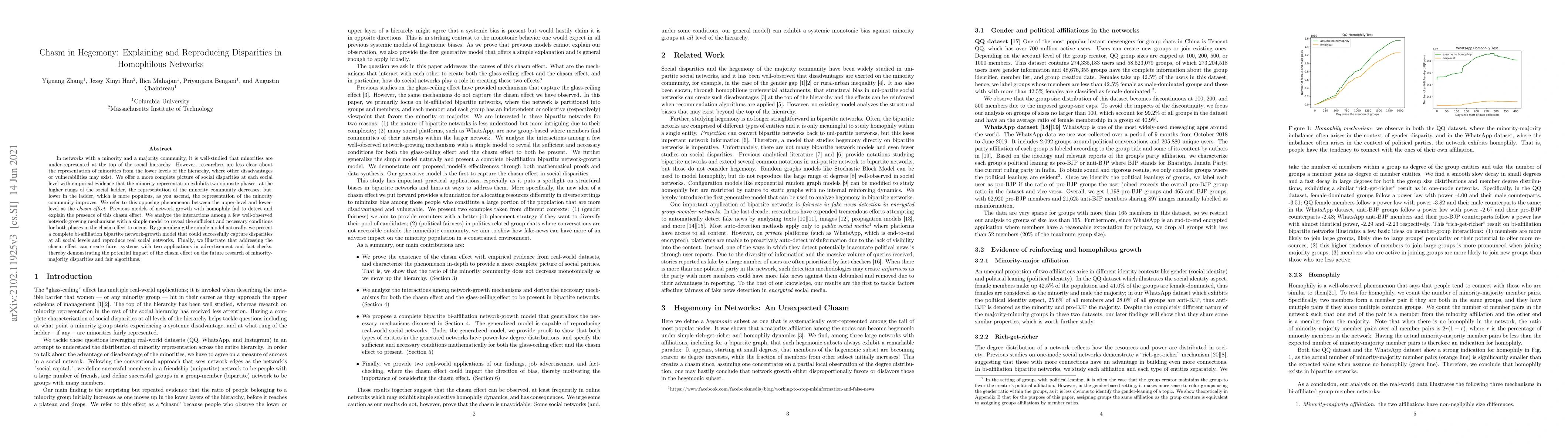 In networks with a minority and a majority community, it is well-studied that minorities are under-represented at the top of the social hierarchy. However, researchers are less clear about the representation of minorities from the lower levels of the hierarchy, where other disadvantages or vulnerabilities may exist. We offer a more complete picture of social disparities at each social level with empirical evidence that the minority representation exhibits two opposite phases: at the higher rungs of the social ladder, the representation of the minority community decreases; but, lower in the ladder, which is more populous, as you ascend, the representation of the minority community improves. We refer to this opposing phenomenon between the upper-level and lower-level as the \emph{chasm effect}. Previous models of network growth with homophily fail to detect and explain the presence of this chasm effect. We analyze the interactions among a few well-observed network-growing mechanisms with a simple model to reveal the sufficient and necessary conditions for both phases in the chasm effect to occur. By generalizing the simple model naturally, we present a complete bi-affiliation bipartite network-growth model that could successfully capture disparities at all social levels and reproduce real social networks. Finally, we illustrate that addressing the chasm effect can create fairer systems with two applications in advertisement and fact-checks, thereby demonstrating the potential impact of the chasm effect on the future research of minority-majority disparities and fair algorithms.