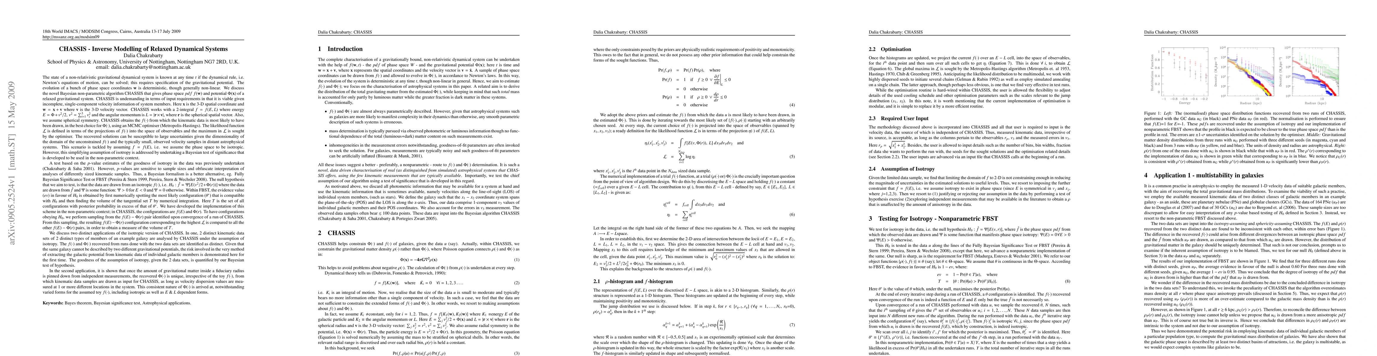 The state of a non-relativistic gravitational dynamical system is known at any time $t$ if the dynamical rule, i.e. Newton's equations of motion, can be solved; this requires specification of the gravitational potential. The evolution of a bunch of phase space coordinates ${\bf w}$ is deterministic, though generally non-linear. We discuss the novel Bayesian non-parametric algorithm CHASSIS that gives phase space $pdf$ $f({\bf w})$ and potential $\Phi({\bf x})$ of a relaxed gravitational system. CHASSIS is undemanding in terms of input requirements in that it is viable given incomplete, single-component velocity information of system members. Here ${\bf x}$ is the 3-D spatial coordinate and ${\bf w}={\bf x+v}$ where ${\bf v}$ is the 3-D velocity vector. CHASSIS works with a 2-integral $f=f(E, L)$ where energy $E=\Phi + v^2/2, \: v^2 = \sum_{i=1}^{3}{v_i^2}$ and the angular momentum is $L = |{\bf r}\times{\bf v}|$, where ${\bf r}$ is the spherical spatial vector. Also, we assume spherical symmetry. CHASSIS obtains the $f(\cdot)$ from which the kinematic data is most likely to have been drawn, in the best choice for $\Phi(\cdot)$, using an MCMC optimiser (Metropolis-Hastings). The likelihood function ${\cal{L}}$ is defined in terms of the projections of $f(\cdot)$ into the space of observables and the maximum in ${\cal{L}}$ is sought by the optimiser.