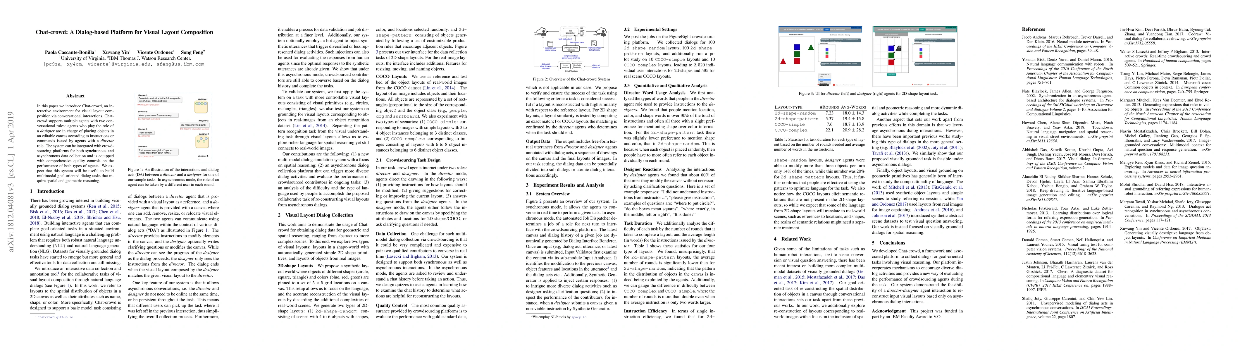 In this paper we introduce Chat-crowd, an interactive environment for visual layout composition via conversational interactions. Chat-crowd supports multiple agents with two conversational roles: agents who play the role of a designer are in charge of placing objects in an editable canvas according to instructions or commands issued by agents with a director role. The system can be integrated with crowdsourcing platforms for both synchronous and asynchronous data collection and is equipped with comprehensive quality controls on the performance of both types of agents. We expect that this system will be useful to build multimodal goal-oriented dialog tasks that require spatial and geometric reasoning.