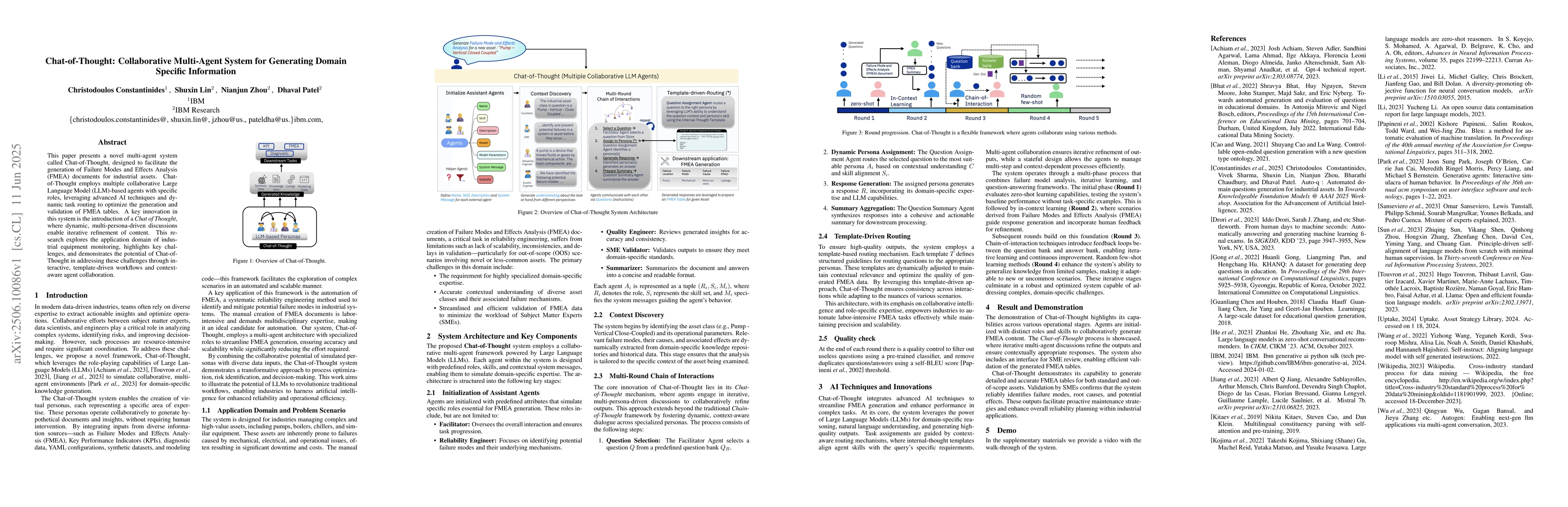 This paper presents a novel multi-agent system called Chat-of-Thought, designed to facilitate the generation of Failure Modes and Effects Analysis (FMEA) documents for industrial assets. Chat-of-Thought employs multiple collaborative Large Language Model (LLM)-based agents with specific roles, leveraging advanced AI techniques and dynamic task routing to optimize the generation and validation of FMEA tables. A key innovation in this system is the introduction of a Chat of Thought, where dynamic, multi-persona-driven discussions enable iterative refinement of content. This research explores the application domain of industrial equipment monitoring, highlights key challenges, and demonstrates the potential of Chat-of-Thought in addressing these challenges through interactive, template-driven workflows and context-aware agent collaboration.