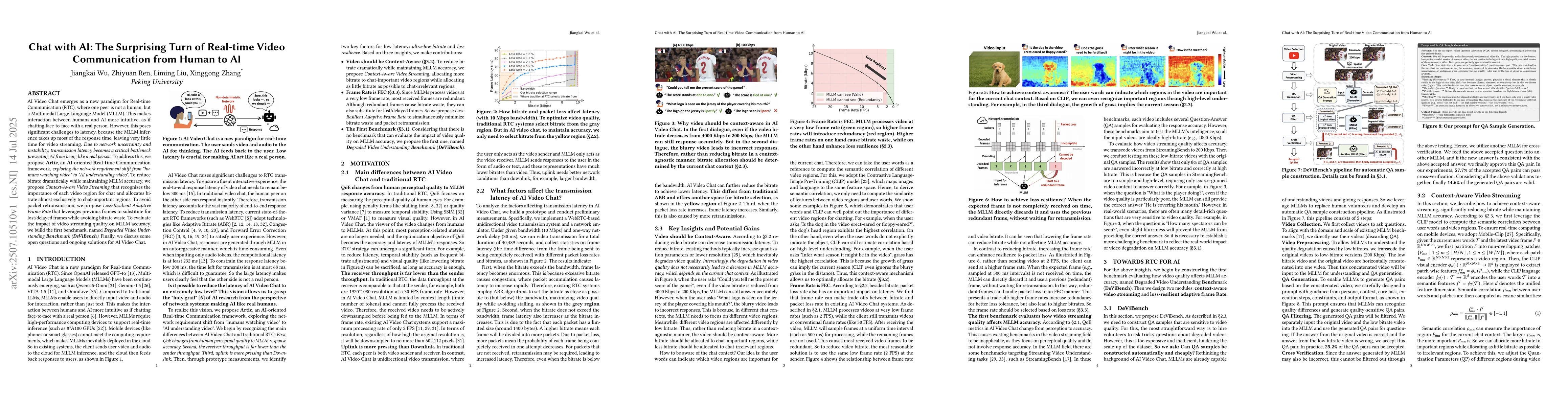 AI Video Chat emerges as a new paradigm for Real-time Communication (RTC), where one peer is not a human, but a Multimodal Large Language Model (MLLM). This makes interaction between humans and AI more intuitive, as if chatting face-to-face with a real person. However, this poses significant challenges to latency, because the MLLM inference takes up most of the response time, leaving very little time for video streaming. Due to network uncertainty and instability, transmission latency becomes a critical bottleneck preventing AI from being like a real person. To address this, we propose Artic, an AI-oriented Real-time Communication framework, exploring the network requirement shift from "humans watching video" to "AI understanding video". To reduce bitrate dramatically while maintaining MLLM accuracy, we propose Context-Aware Video Streaming that recognizes the importance of each video region for chat and allocates bitrate almost exclusively to chat-important regions. To avoid packet retransmission, we propose Loss-Resilient Adaptive Frame Rate that leverages previous frames to substitute for lost/delayed frames while avoiding bitrate waste. To evaluate the impact of video streaming quality on MLLM accuracy, we build the first benchmark, named Degraded Video Understanding Benchmark (DeViBench). Finally, we discuss some open questions and ongoing solutions for AI Video Chat.