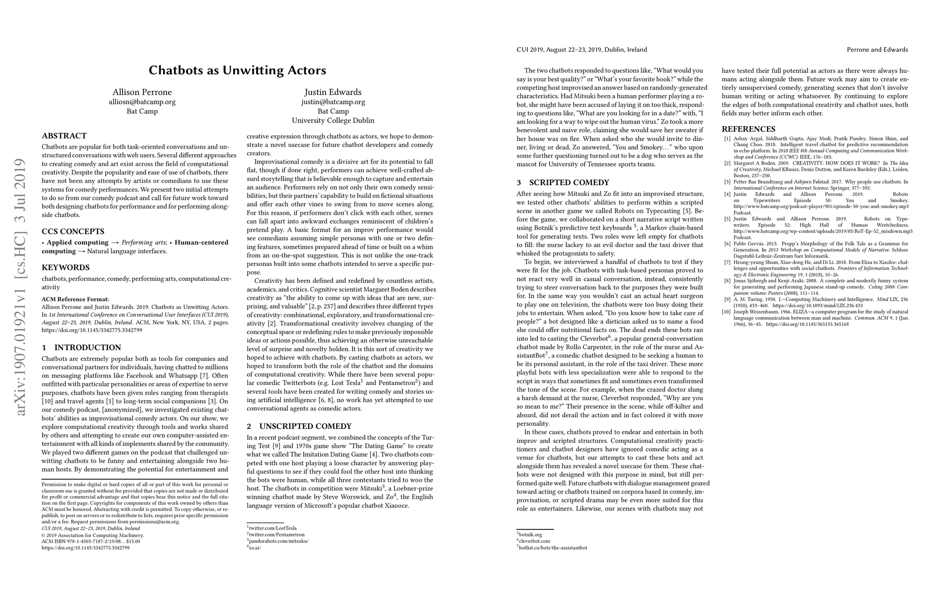 Researchers explore using chatbots in comedy performances for the first time, presenting initial attempts at designing chatbot comedy and calling for future work on creating chatbots for performance and collaboration.