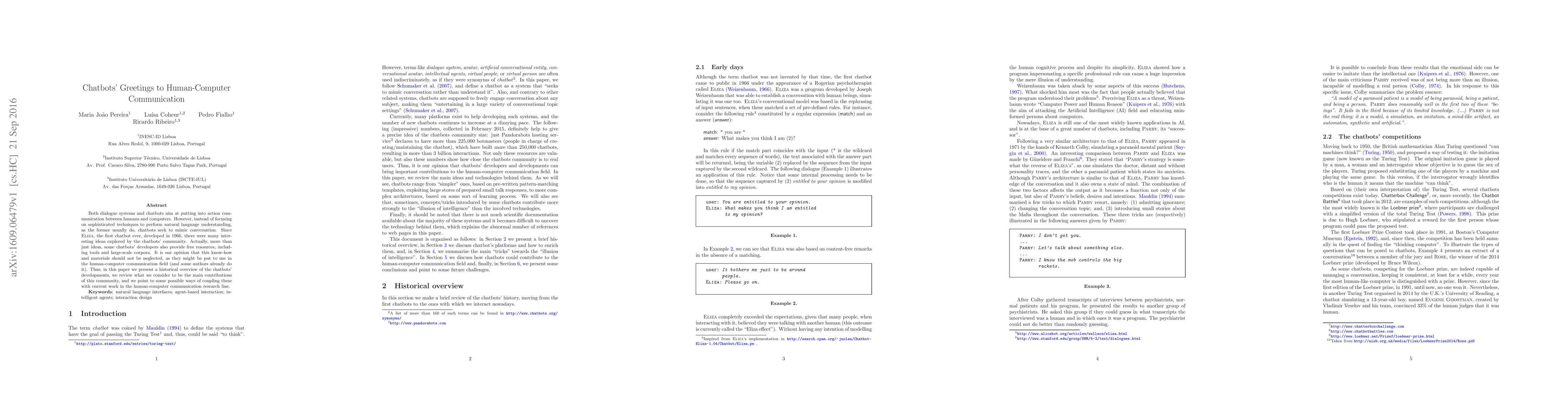 Both dialogue systems and chatbots aim at putting into action communication between humans and computers. However, instead of focusing on sophisticated techniques to perform natural language understanding, as the former usually do, chatbots seek to mimic conversation. Since Eliza, the first chatbot ever, developed in 1966, there were many interesting ideas explored by the chatbots' community. Actually, more than just ideas, some chatbots' developers also provide free resources, including tools and large-scale corpora. It is our opinion that this know-how and materials should not be neglected, as they might be put to use in the human-computer communication field (and some authors already do it). Thus, in this paper we present a historical overview of the chatbots' developments, we review what we consider to be the main contributions of this community, and we point to some possible ways of coupling these with current work in the human-computer communication research line.