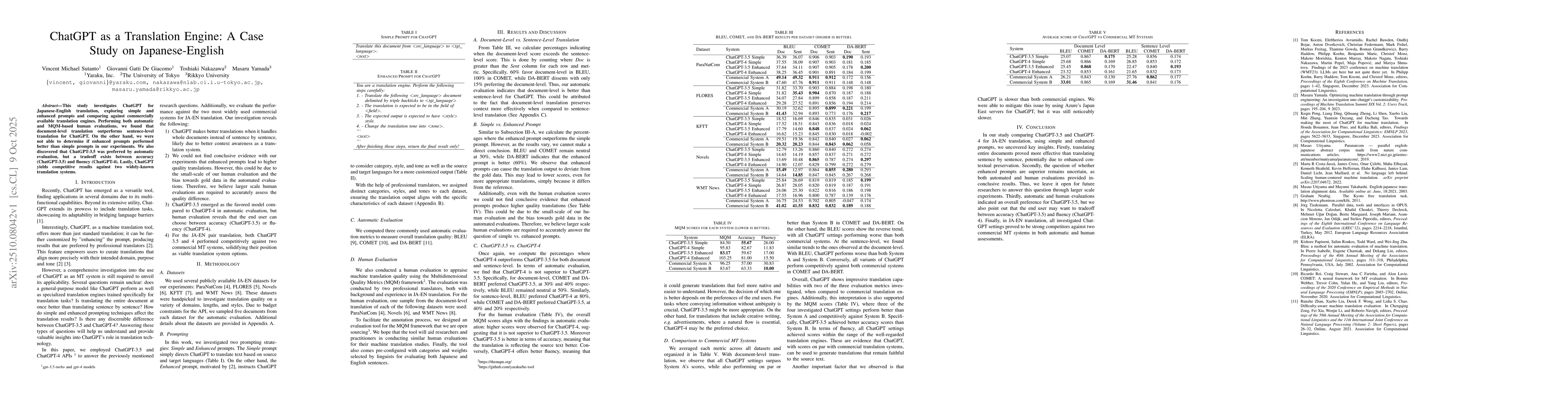 First comprehensive case study comparing ChatGPT's translation capabilities with commercial systems specifically for Japanese-English, including both document and sentence-level analyses.