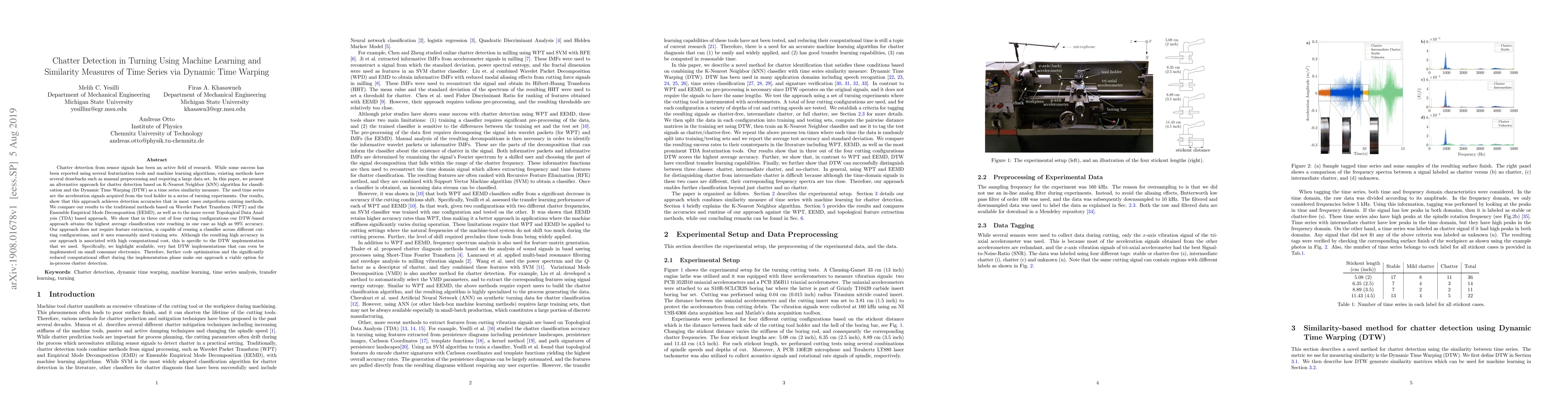This paper proposes a chatter detection method using K-Nearest Neighbor (kNN) classification and Dynamic Time Warping (DTW) for time series similarity, achieving high detection accuracy without manual preprocessing and large datasets. The method outperforms traditional methods and shows potential for in-process chatter detection despite high computational costs, which can be mitigated with optimized DTW implementations.