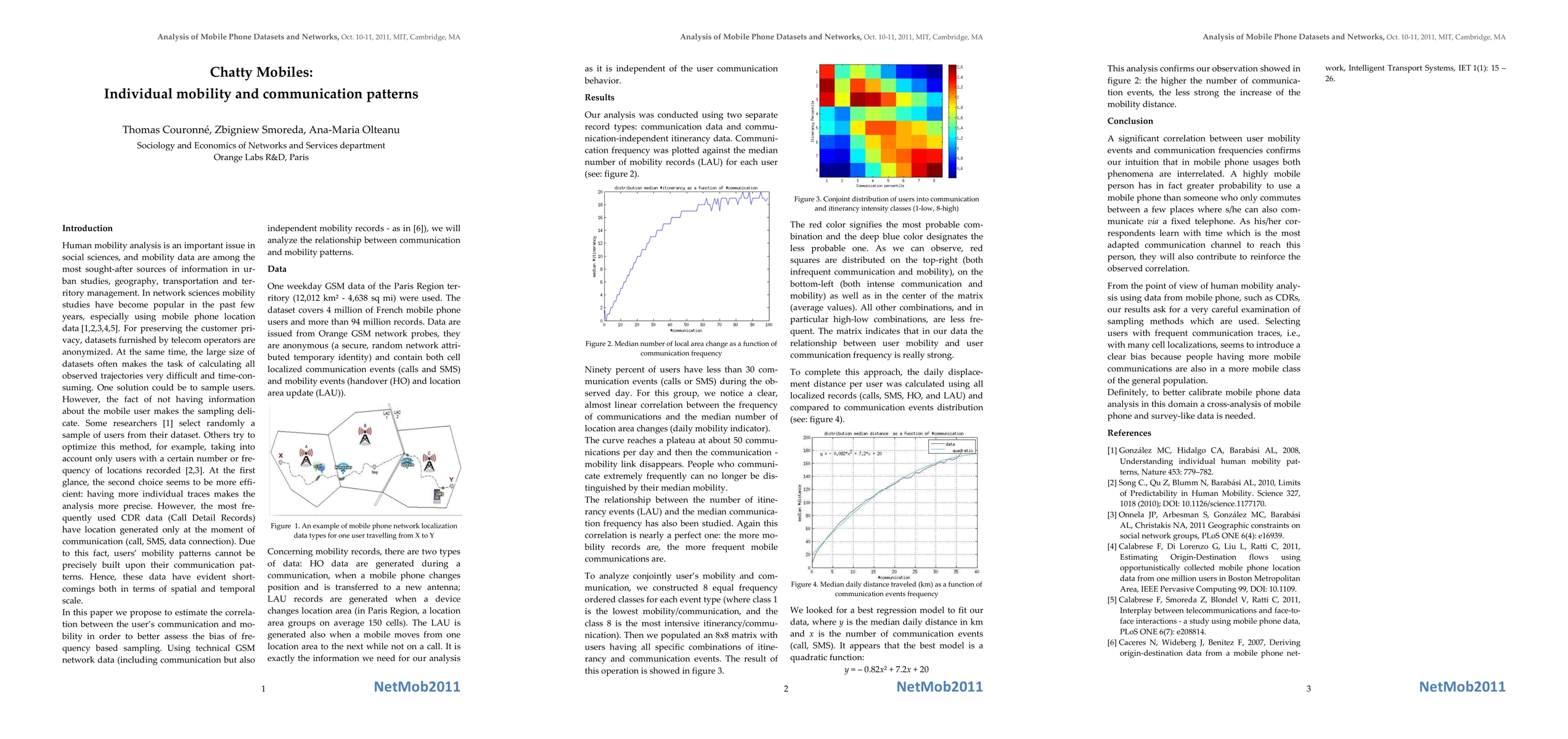 Human mobility analysis is an important issue in social sciences, and mobility data are among the most sought-after sources of information in ur- Data ban studies, geography, transportation and territory management. In network sciences mobility studies have become popular in the past few years, especially using mobile phone location data. For preserving the customer privacy, datasets furnished by telecom operators are anonymized. At the same time, the large size of datasets often makes the task of calculating all observed trajectories very difficult and time-consuming. One solution could be to sample users. However, the fact of not having information about the mobile user makes the sampling delicate. Some researchers select randomly a sample of users from their dataset. Others try to optimize this method, for example, taking into account only users with a certain number or frequency of locations recorded. At the first glance, the second choice seems to be more efficient: having more individual traces makes the analysis more precise. However, the most frequently used CDR data (Call Detail Records) have location generated only at the moment of communication (call, SMS, data connection). Due to this fact, users mobility patterns cannot be precisely built upon their communication patterns. Hence, these data have evident short-comings both in terms of spatial and temporal scale. In this paper we propose to estimate the correlation between the users communication and mo- bility in order to better assess the bias of frequency based sampling. Using technical GSM network data (including communication but also independent mobility records), we will analyze the relationship between communication and mobility patterns.