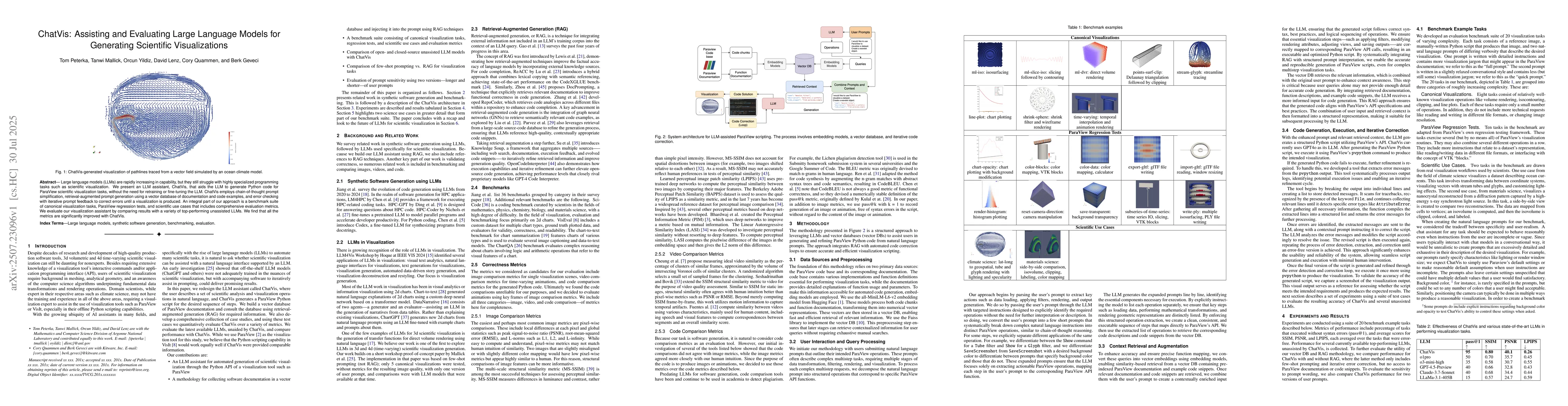 Large language models (LLMs) are rapidly increasing in capability, but they still struggle with highly specialized programming tasks such as scientific visualization. We present an LLM assistant, ChatVis, that aids the LLM to generate Python code for ParaView scientific visualization tasks, without the need for retraining or fine-tuning the LLM. ChatVis employs chain-of-thought prompt simplification, retrieval-augmented prompt generation using a vector database of documentation and code examples, and error checking with iterative prompt feedback to correct errors until a visualization is produced. An integral part of our approach is a benchmark suite of canonical visualization tasks, ParaView regression tests, and scientific use cases that includes comprehensive evaluation metrics. We evaluate our visualization assistant by comparing results with a variety of top-performing unassisted LLMs. We find that all the metrics are significantly improved with ChatVis.