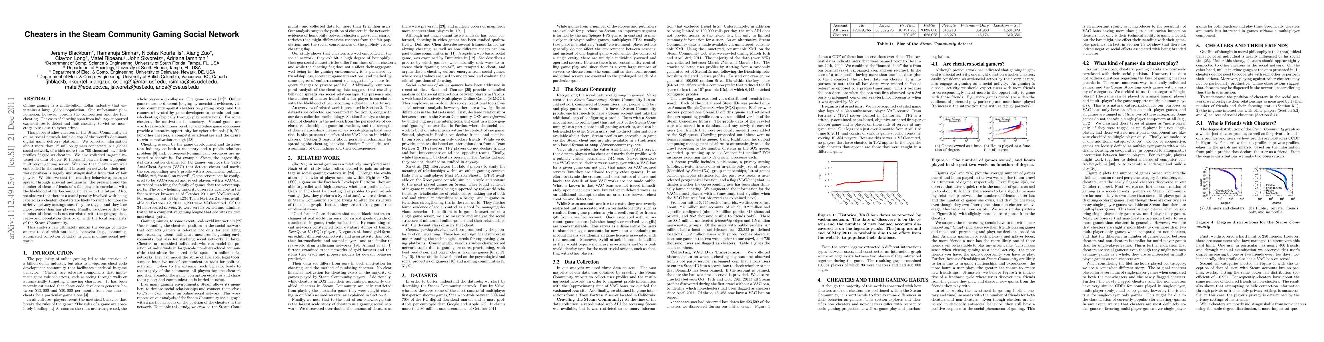 Online gaming is a multi-billion dollar industry that entertains a large, global population. One unfortunate phenomenon, however, poisons the competition and the fun: cheating. The costs of cheating span from industry-supported expenditures to detect and limit cheating, to victims' monetary losses due to cyber crime. This paper studies cheaters in the Steam Community, an online social network built on top of the world's dominant digital game delivery platform. We collected information about more than 12 million gamers connected in a global social network, of which more than 700 thousand have their profiles flagged as cheaters. We also collected in-game interaction data of over 10 thousand players from a popular multiplayer gaming server. We show that cheaters are well embedded in the social and interaction networks: their network position is largely undistinguishable from that of fair players. We observe that the cheating behavior appears to spread through a social mechanism: the presence and the number of cheater friends of a fair player is correlated with the likelihood of her becoming a cheater in the future. Also, we observe that there is a social penalty involved with being labeled as a cheater: cheaters are likely to switch to more restrictive privacy settings once they are tagged and they lose more friends than fair players. Finally, we observe that the number of cheaters is not correlated with the geographical, real-world population density, or with the local popularity of the Steam Community. This analysis can ultimately inform the design of mechanisms to deal with anti-social behavior (e.g., spamming, automated collection of data) in generic online social networks.