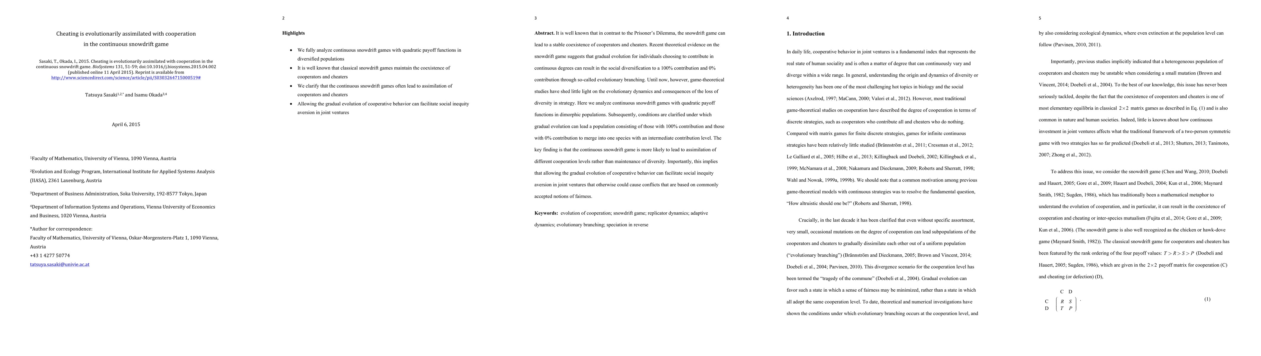 It is well known that in contrast to the Prisoner's Dilemma, the snowdrift game can lead to a stable coexistence of cooperators and cheaters. Recent theoretical evidence on the snowdrift game suggests that gradual evolution for individuals choosing to contribute in continuous degrees can result in the social diversification to a 100% contribution and 0% contribution through so-called evolutionary branching. Until now, however, game-theoretical studies have shed little light on the evolutionary dynamics and consequences of the loss of diversity in strategy. Here we analyze continuous snowdrift games with quadratic payoff functions in dimorphic populations. Subsequently, conditions are clarified under which gradual evolution can lead a population consisting of those with 100% contribution and those with 0% contribution to merge into one species with an intermediate contribution level. The key finding is that the continuous snowdrift game is more likely to lead to assimilation of different cooperation levels rather than maintenance of diversity. Importantly, this implies that allowing the gradual evolution of cooperative behavior can facilitate social inequity aversion in joint ventures that otherwise could cause conflicts that are based on commonly accepted notions of fairness.