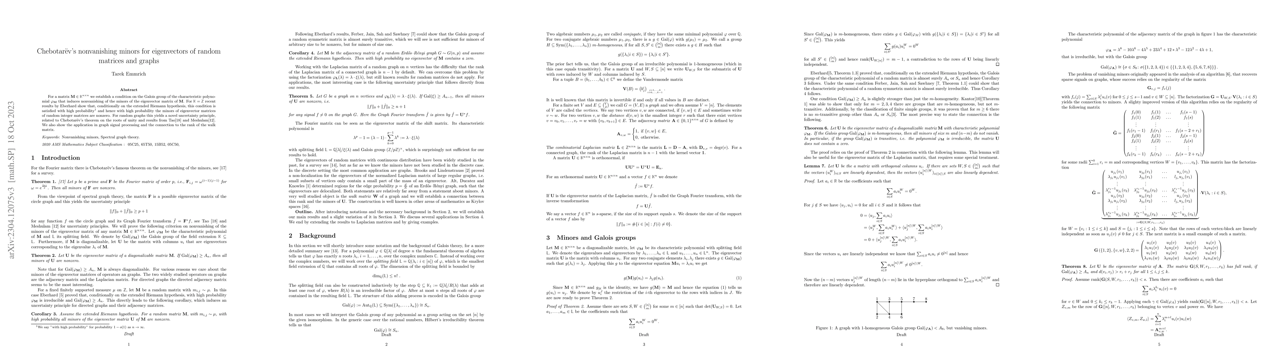 This paper establishes a condition on the Galois group of a matrix's characteristic polynomial to ensure nonvanishing minors of its eigenvector matrix. It shows that under certain conditions, this condition holds for random integer matrices with high probability, leading to a novel uncertainty principle for random graphs and applications in graph signal processing.