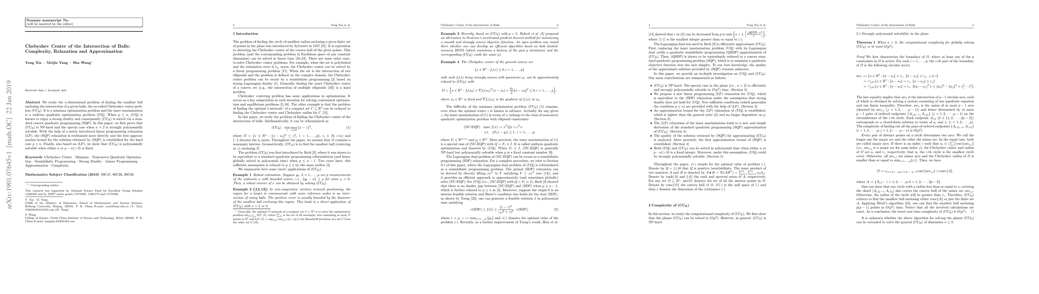 We study the n-dimensional problem of finding the smallest ball enclosing the intersection of p given balls, the so-called Chebyshev center problem (CCB). It is a minimax optimization problem and the inner maximization is a uniform quadratic optimization problem (UQ). When p<=n, (UQ) is known to enjoy a strong duality and consequently (CCB) is solved via a standard convex quadratic programming (SQP). In this paper, we first prove that (CCB) is NP-hard and the special case when n = 2 is strongly polynomially solved. With the help of a newly introduced linear programming relaxation (LP), the (SQP) relaxation is reobtained more directly and the first approximation bound for the solution obtained by (SQP) is established for the hard case p>n. Finally, also based on (LP), we show that (CCB) is polynomially solved when either n or p-n(> 0) is fixed.