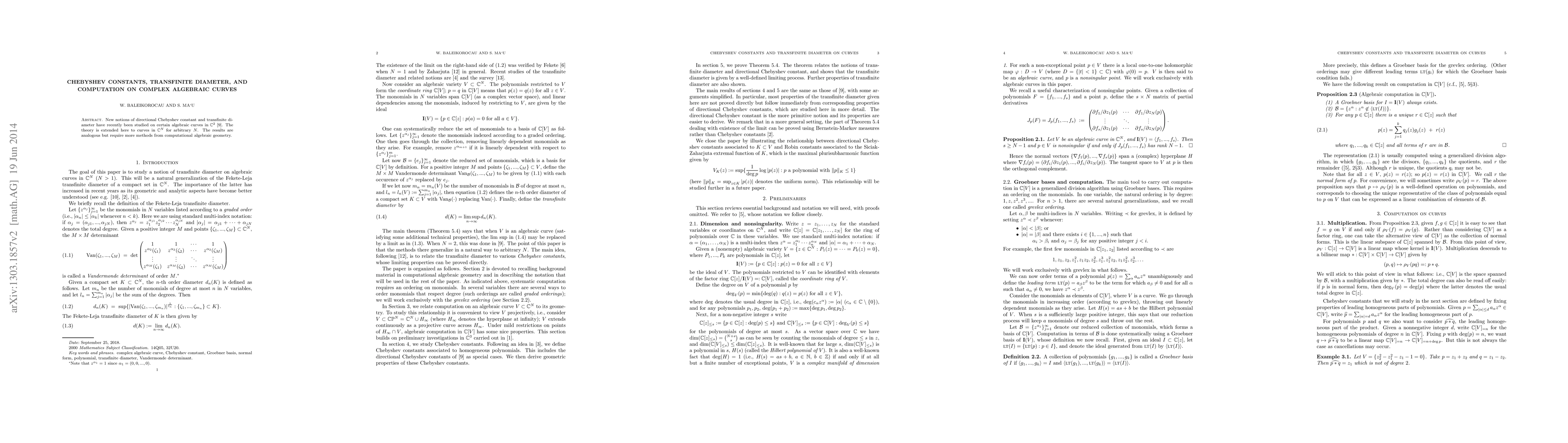 This research extends the study of directional Chebyshev constants and transfinite diameter to algebraic curves in $bbc^N$ for arbitrary $N$, requiring new methods from computational algebraic geometry.