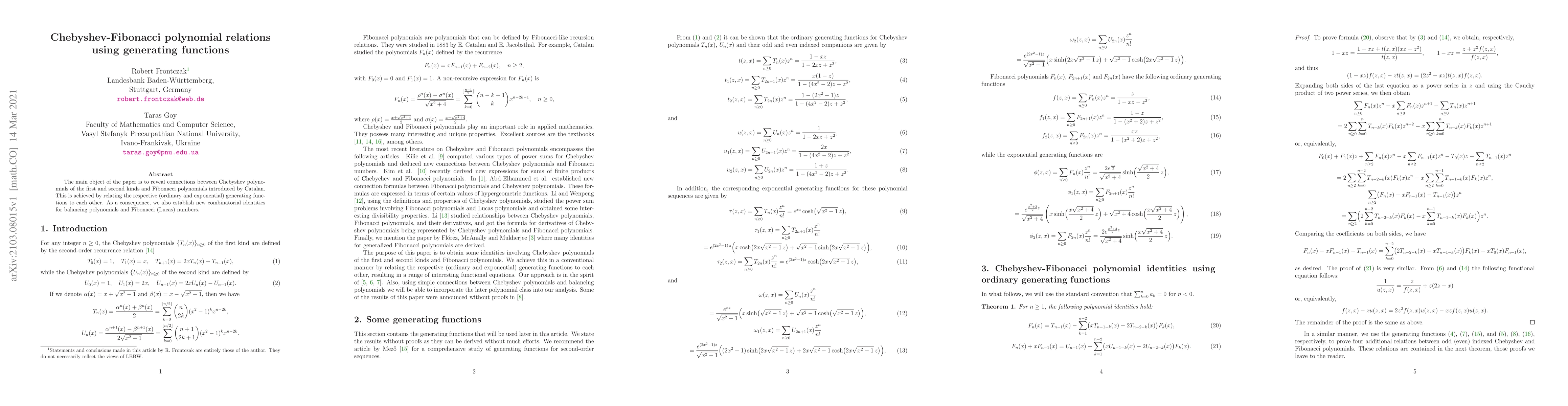 The paper establishes connections between Chebyshev and Fibonacci polynomials through their generating functions, leading to new combinatorial identities for balancing polynomials and Fibonacci numbers.