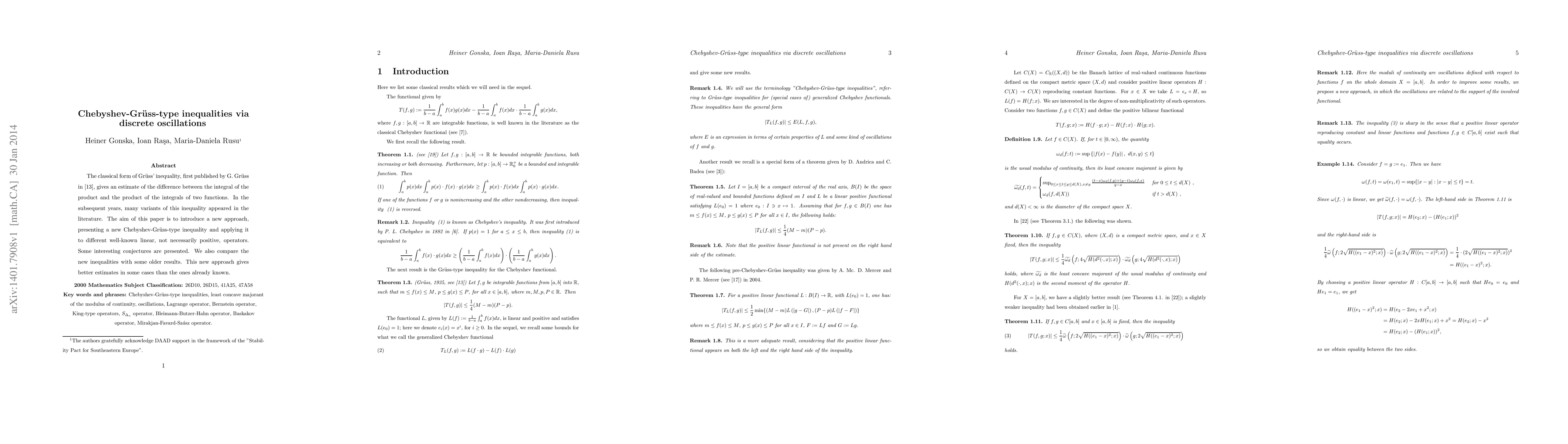 The classical form of Gr\"uss' inequality, first published by G. Gr\"{u}ss in 1935, gives an estimate of the difference between the integral of the product and the product of the integrals of two functions. In the subsequent years, many variants of this inequality appeared in the literature. The aim of this paper is to introduce a different approach, presenting a new Chebyshev-Gr\"uss-type inequality and applying it to different well-known linear, not necessarily positive, operators. Some conjectures are presented as well. We also compare the new inequalities with some older results. This new approach gives better estimates in some cases than the ones already known.