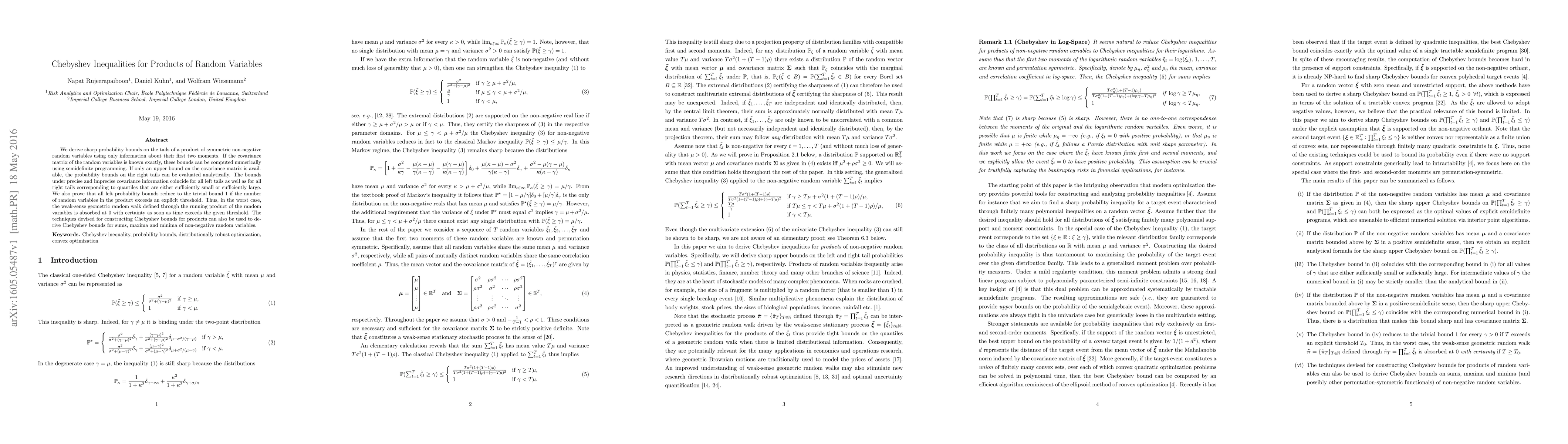 We derive sharp probability bounds on the tails of a product of symmetric non-negative random variables using only information about their first two moments. If the covariance matrix of the random variables is known exactly, these bounds can be computed numerically using semidefinite programming. If only an upper bound on the covariance matrix is available, the probability bounds on the right tails can be evaluated analytically. The bounds under precise and imprecise covariance information coincide for all left tails as well as for all right tails corresponding to quantiles that are either sufficiently small or sufficiently large. We also prove that all left probability bounds reduce to the trivial bound 1 if the number of random variables in the product exceeds an explicit threshold. Thus, in the worst case, the weak-sense geometric random walk defined through the running product of the random variables is absorbed at 0 with certainty as soon as time exceeds the given threshold. The techniques devised for constructing Chebyshev bounds for products can also be used to derive Chebyshev bounds for sums, maxima and minima of non-negative random variables.