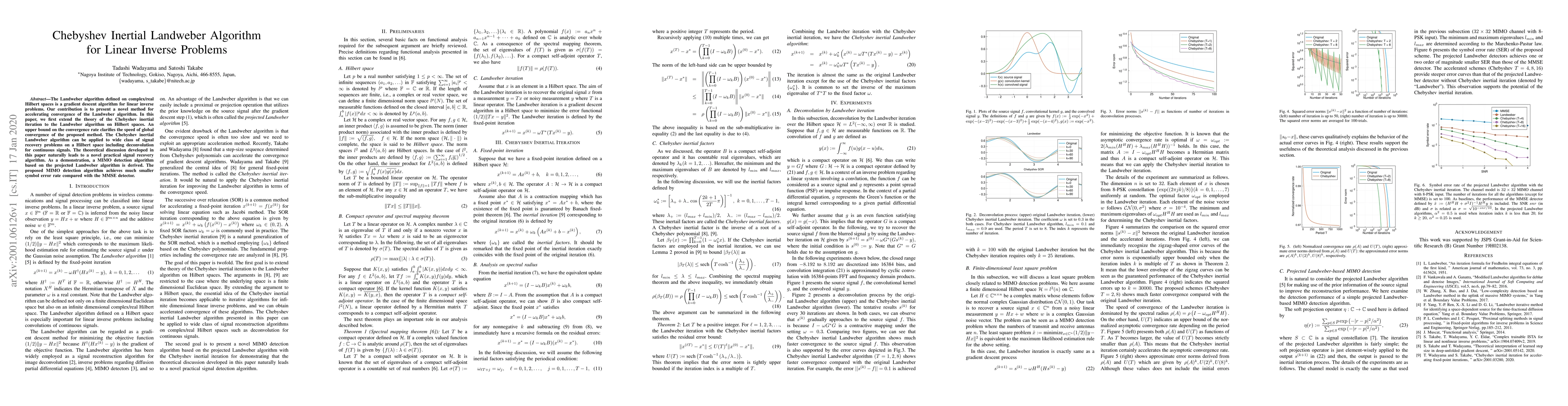 This paper introduces a Chebyshev inertial Landweber algorithm to accelerate the convergence of the Landweber algorithm for linear inverse problems, providing a theoretical upper bound on its convergence rate. The method is demonstrated through a MIMO detection algorithm that significantly reduces the symbol error rate compared to traditional MMSE detectors.