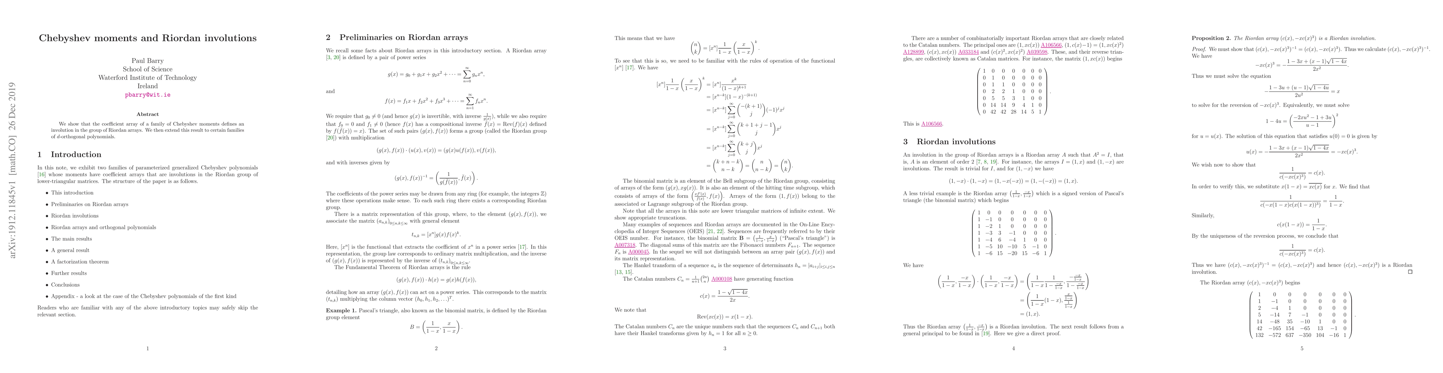 We show that the coefficient array of a family of Chebyshev moments defines an involution in the group of Riordan arrays. We then extend this result to certain families of $d$-orthogonal polynomials.