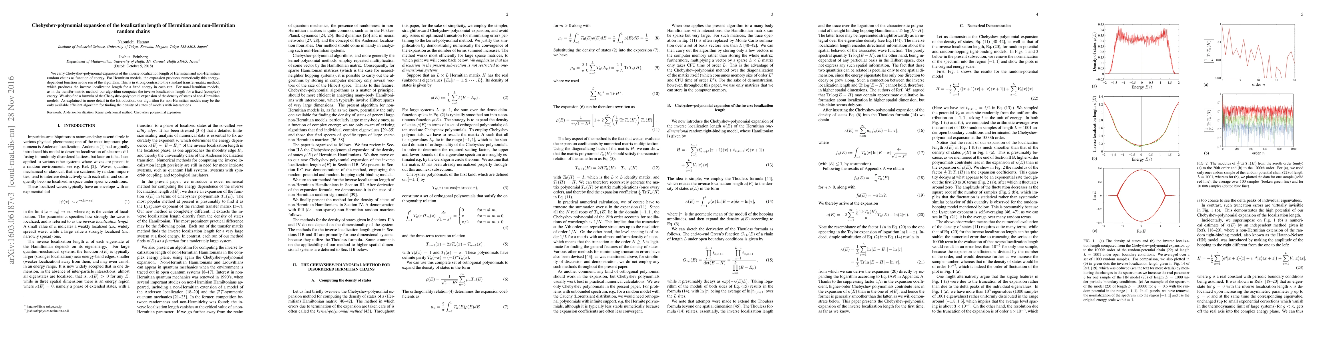 We carry Chebyshev-polynomial expansion of the inverse localization length of Hermitian and non-Hermitian random chains as function of energy. For Hermitian models, the expansion produces numerically this energy-dependent function in one run of the algorithm. This is in strong contrast to the standard transfer-matrix method, which produces the inverse localization length for a fixed energy in each run. For non-Hermitian models, as in the transfer-matrix method, our algorithm computes the inverse localization length for a fixed (complex) energy. We also find a formula of the Chebyshev-polynomial expansion of the density of states of non-Hermitian models. As explained in more detail in the Introduction, our algorithm for non-Hermitian models may be the only available efficient algorithm for finding the density of states of models with interactions.