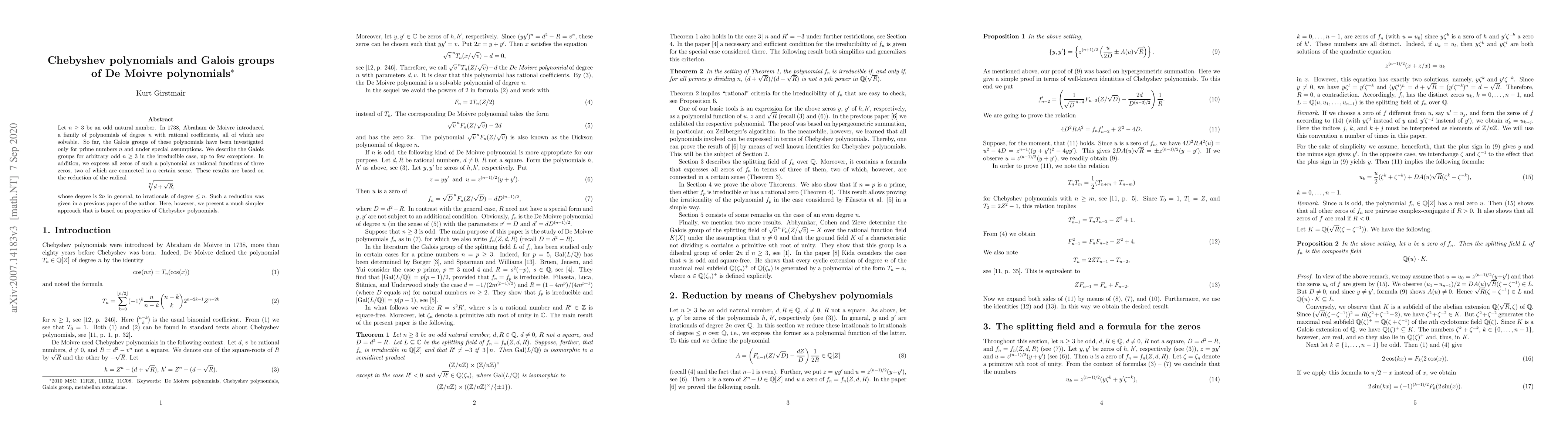 Let $n\ge 3$ be an odd natural number. In 1738, Abraham de Moivre introduced a family of polynomials of degree $n$ with rational coefficients, all of which are solvable. So far, the Galois groups of these polynomials have been investigated only for prime numbers $n$ and under special assumptions. We describe the Galois groups for arbitrary odd $n\ge 3$ in the irreducible case, up to few exceptions. In addition, we express all zeros of such a polynomial as rational functions of three zeros, two of which are connected in a certain sense. These results are based on the reduction of the radical $$ \sqrt[n]{d+\sqrt R}, $$ whose degree is $2n$ in general, to irrationals of degree $\le n$. Such a reduction was given in a previous paper of the author. Here, however, we present a much simpler approach that is based on properties of Chebyshev polynomials.