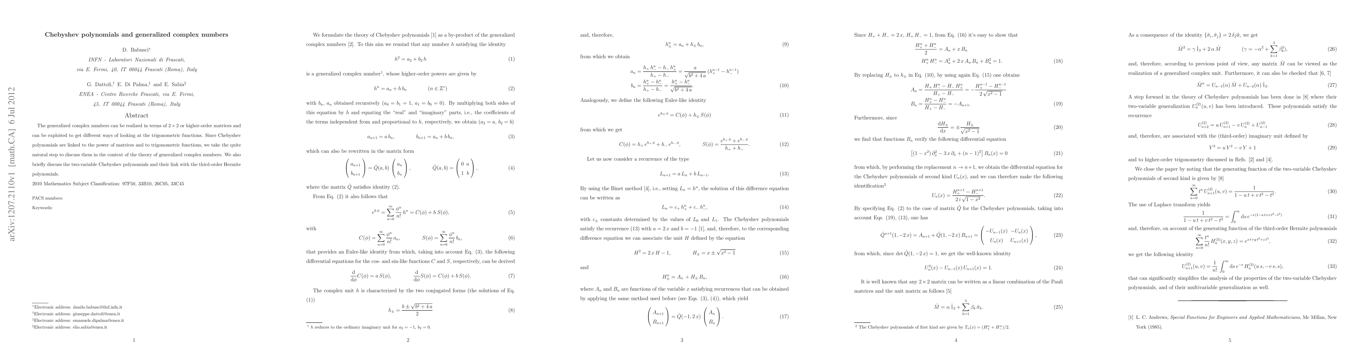 This paper explores the connection between Chebyshev polynomials and generalized complex numbers, utilizing $2\times2$ matrices to reinterpret trigonometric functions. It also examines two-variable Chebyshev polynomials and their relationship with third-order Hermite polynomials.