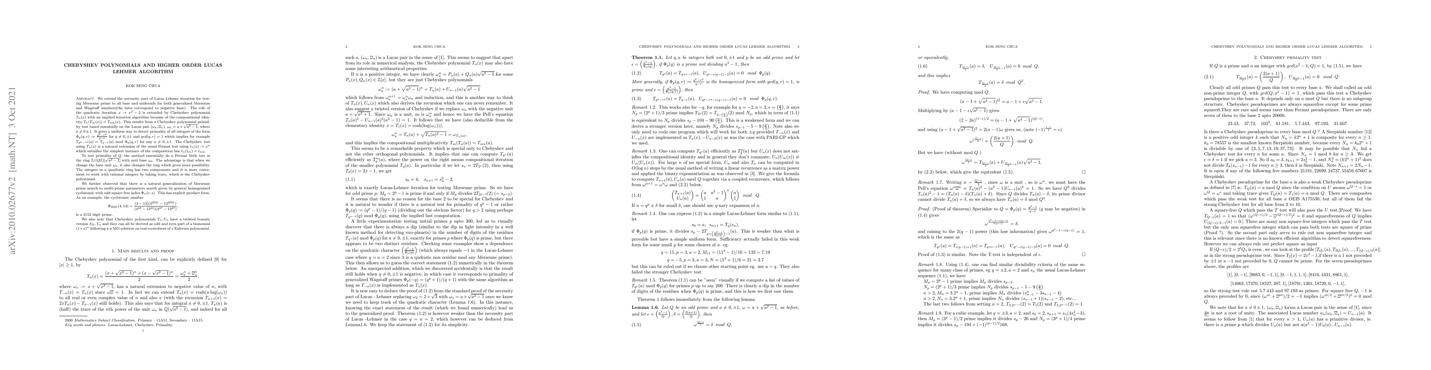 We extend the necessity part of Lucas Lehmer iteration for testing Mersenne prime to all base and uniformly for both generalized Mersenne and Wagstaff numbers(the later correspond to negative base). The role of the quadratic iteration $x \rightarrow x^2-2$ is extended by Chebyshev polynomial $T_n(x)$ with an implied iteration algorithm because of the compositional identity $T_n(T_m(x))=T_{nm}(x)$. This results from a Chebyshev polynomial primality test based essentially on the Lucas pair $(\omega_a,\overline{\omega}_a)$, $\omega_a=a+\sqrt{a^2-1}$, where $a \neq 0 \pm 1$. It seems interesting that the arithmetic are all coded in the Chebyshev polynomials $T_n(x)$.