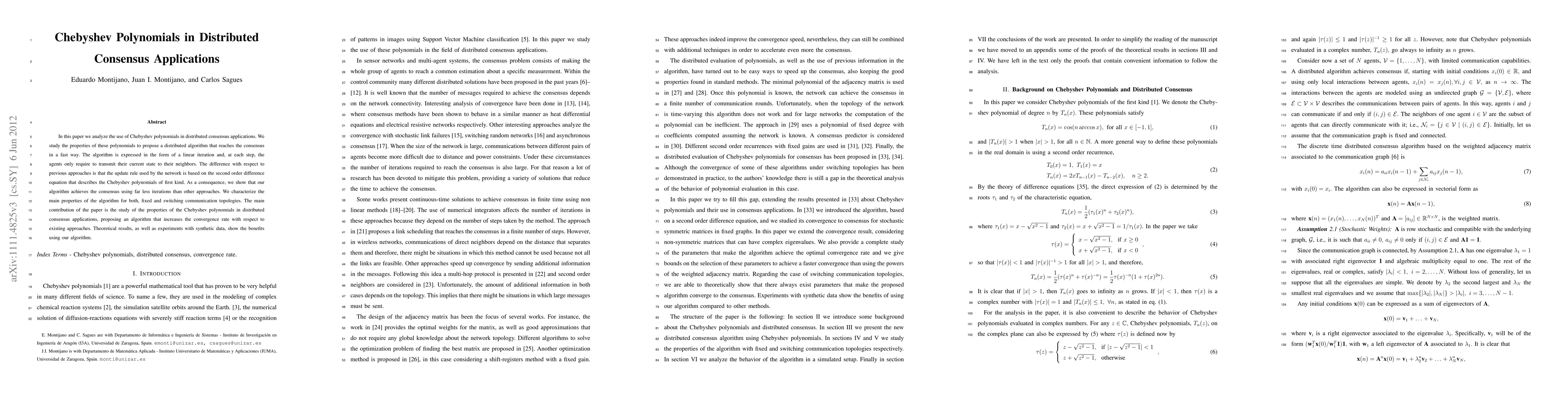 In this paper we analyze the use of Chebyshev polynomials in distributed consensus applications. We study the properties of these polynomials to propose a distributed algorithm that reaches the consensus in a fast way. The algorithm is expressed in the form of a linear iteration and, at each step, the agents only require to transmit their current state to their neighbors. The difference with respect to previous approaches is that the update rule used by the network is based on the second order difference equation that describes the Chebyshev polynomials of first kind. As a consequence, we show that our algorithm achieves the consensus using far less iterations than other approaches. We characterize the main properties of the algorithm for both, fixed and switching communication topologies. The main contribution of the paper is the study of the properties of the Chebyshev polynomials in distributed consensus applications, proposing an algorithm that increases the convergence rate with respect to existing approaches. Theoretical results, as well as experiments with synthetic data, show the benefits using our algorithm.