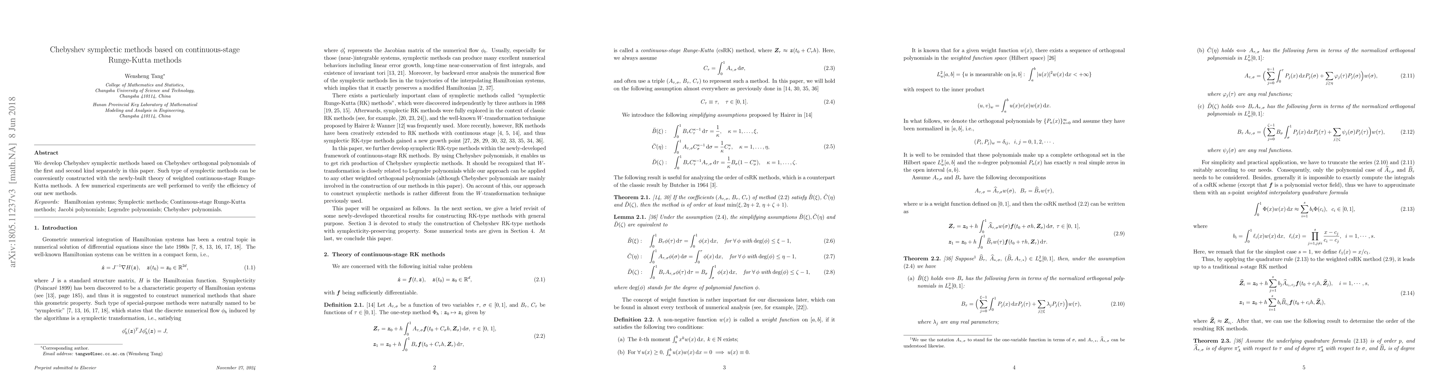 This paper introduces Chebyshev symplectic methods based on continuous-stage Runge-Kutta methods, utilizing Chebyshev orthogonal polynomials for enhanced accuracy. Numerical experiments demonstrate the efficiency of these newly developed methods.
