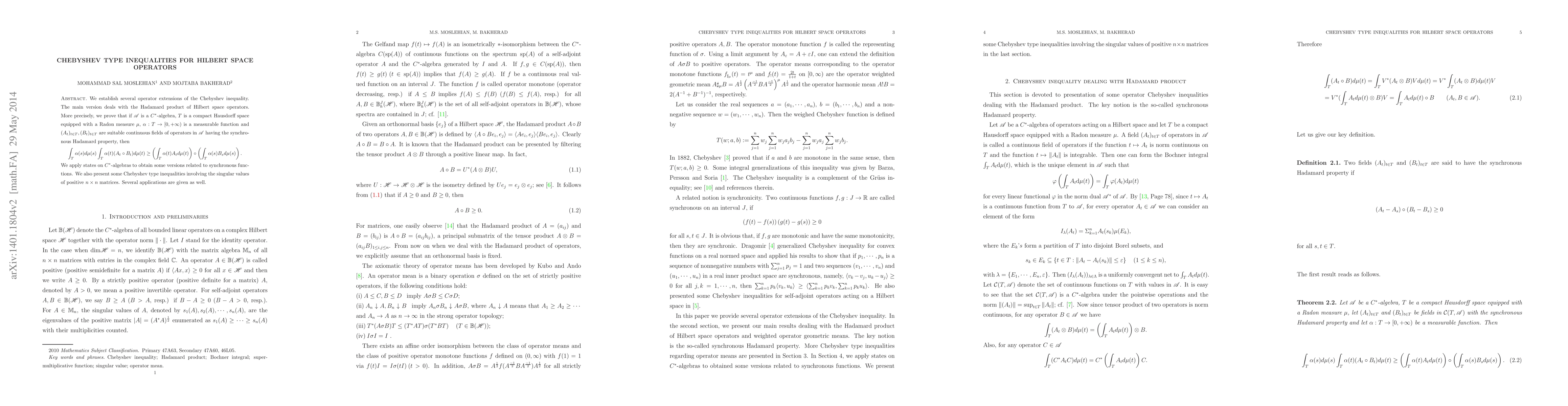 This research establishes operator extensions of the Chebyshev inequality for Hilbert spaces, focusing on the Hadamard product of operators in a $C^*$-algebra. It proves inequalities involving measurable functions, Radon measures, and continuous fields of operators with the synchronous Hadamard property. Applications are given, including Chebyshev-type inequalities for singular values of positive matrices.