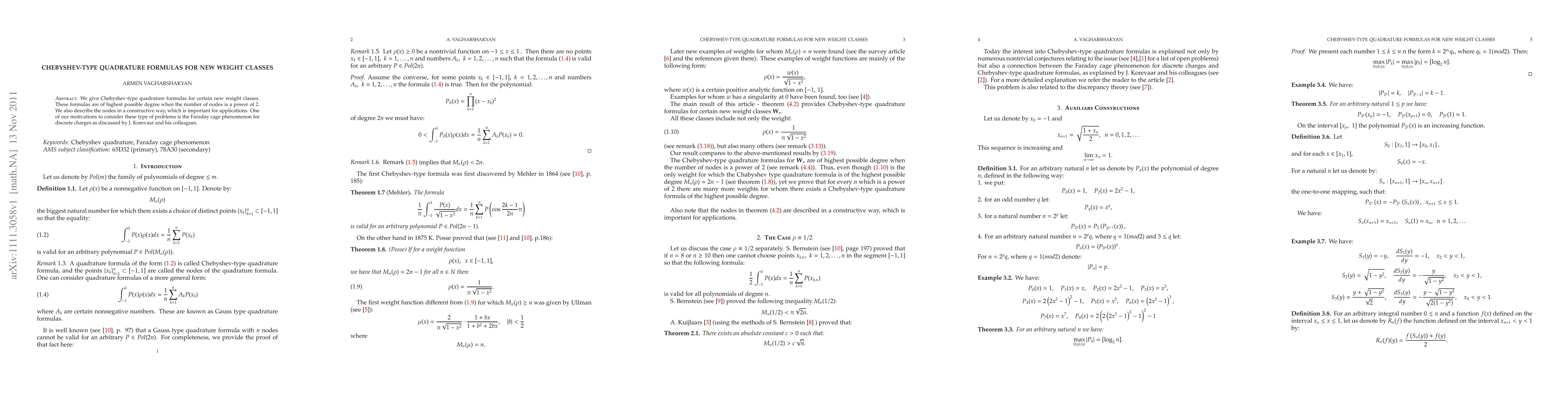 This paper presents Chebyshev-type quadrature formulas for novel weight classes, achieving the highest possible degree when the number of nodes is a power of 2. The nodes are described constructively, which is crucial for practical applications, inspired by the Faraday cage phenomenon for discrete charges.