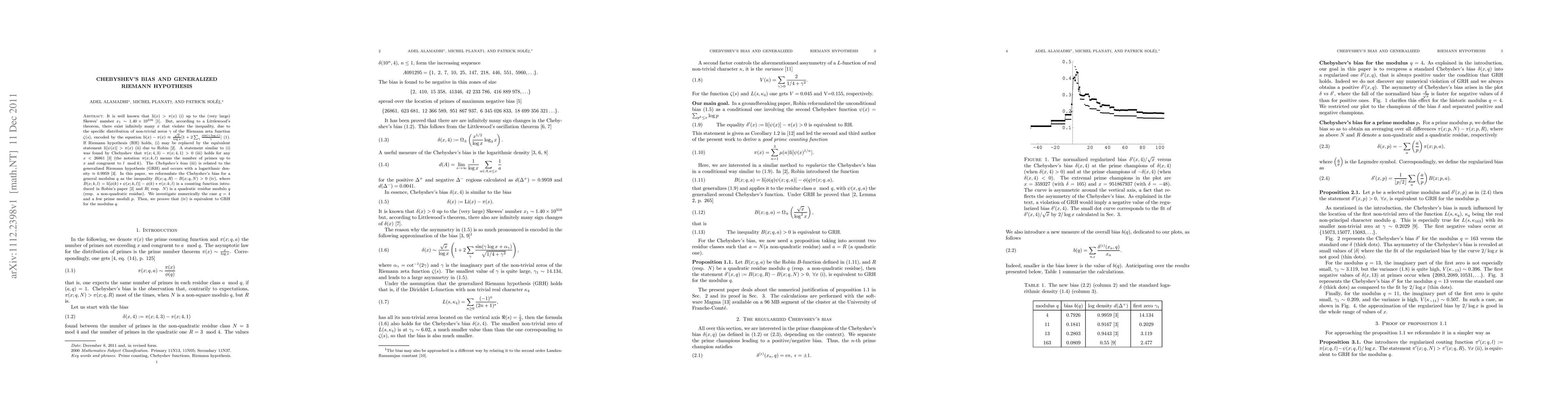 It is well known that $li(x)>\pi(x)$ (i) up to the (very large) Skewes' number $x_1 \sim 1.40 \times 10^{316}$ \cite{Bays00}. But, according to a Littlewood's theorem, there exist infinitely many $x$ that violate the inequality, due to the specific distribution of non-trivial zeros $\gamma$ of the Riemann zeta function $\zeta(s)$, encoded by the equation $li(x)-\pi(x)\approx \frac{\sqrt{x}}{\log x}[1+2 \sum_{\gamma}\frac{\sin (\gamma \log x)}{\gamma}]$ (1). If Riemann hypothesis (RH) holds, (i) may be replaced by the equivalent statement $li[\psi(x)]>\pi(x)$ (ii) due to Robin \cite{Robin84}. A statement similar to (i) was found by Chebyshev that $\pi(x;4,3)-\pi(x;4,1)>0$ (iii) holds for any $x<26861$ \cite{Rubin94} (the notation $\pi(x;k,l)$ means the number of primes up to $x$ and congruent to $l\mod k$). The {\it Chebyshev's bias}(iii) is related to the generalized Riemann hypothesis (GRH) and occurs with a logarithmic density $\approx 0.9959$ \cite{Rubin94}. In this paper, we reformulate the Chebyshev's bias for a general modulus $q$ as the inequality $B(x;q,R)-B(x;q,N)>0$ (iv), where $B(x;k,l)=li[\phi(k)*\psi(x;k,l)]-\phi(k)*\pi(x;k,l)$ is a counting function introduced in Robin's paper \cite{Robin84} and $R$ resp. $N$) is a quadratic residue modulo $q$ (resp. a non-quadratic residue). We investigate numerically the case $q=4$ and a few prime moduli $p$. Then, we proove that (iv) is equivalent to GRH for the modulus $q$.