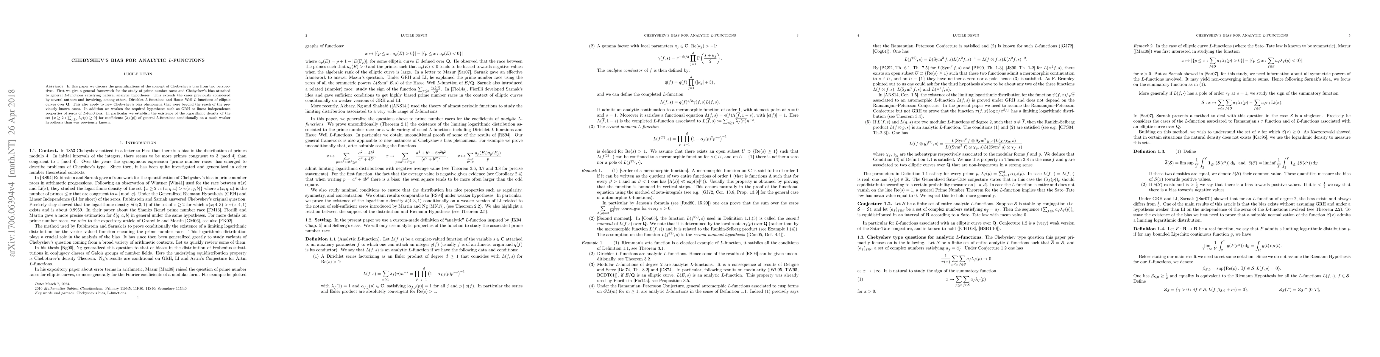 This paper explores the generalization of Chebyshev's bias for analytic L-functions, providing a framework for studying prime number races and extending previous cases to include new phenomena, while also weakening existing hypotheses like GRH. It establishes the existence of a logarithmic density for certain sets of primes under a weaker condition.