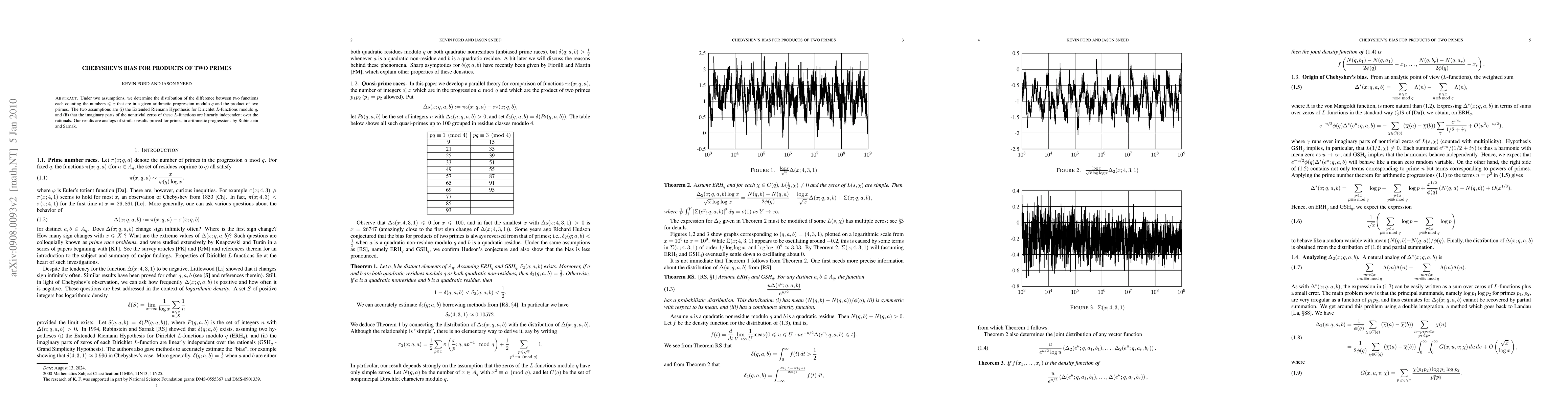 This paper investigates the distribution of products of two primes in arithmetic progressions under the Extended Riemann Hypothesis and linear independence of L-function zeros' imaginary parts. It reveals a reversed bias compared to primes, showing that 89.4% of the time, more products of two primes are 1 mod 4 than 3 mod 4.