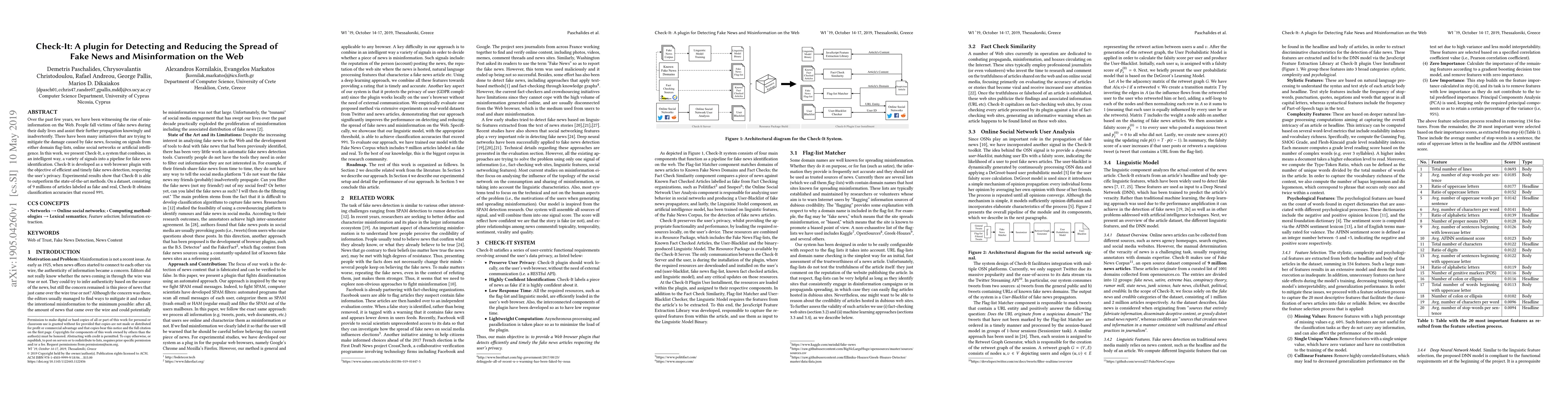 Check-It is a web browser plugin designed to detect and reduce the spread of fake news and misinformation on the web by intelligently combining various signals. Experimental results demonstrate its superior performance, achieving over 99% classification accuracy on a dataset of 9 million labeled articles.