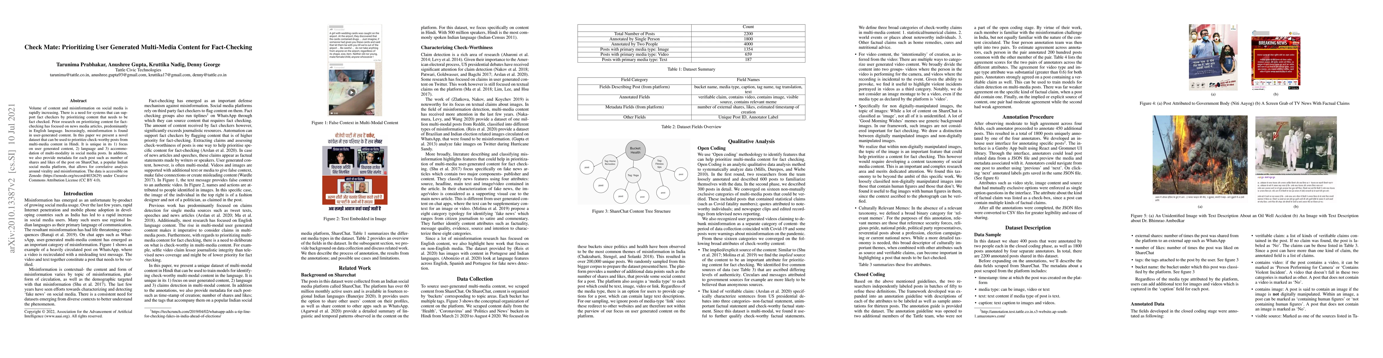 Volume of content and misinformation on social media is rapidly increasing. There is a need for systems that can support fact checkers by prioritizing content that needs to be fact checked. Prior research on prioritizing content for fact-checking has focused on news media articles, predominantly in English language. Increasingly, misinformation is found in user-generated content. In this paper we present a novel dataset that can be used to prioritize check-worthy posts from multi-media content in Hindi. It is unique in its 1) focus on user generated content, 2) language and 3) accommodation of multi-modality in social media posts. In addition, we also provide metadata for each post such as number of shares and likes of the post on ShareChat, a popular Indian social media platform, that allows for correlative analysis around virality and misinformation. The data is accessible on Zenodo (https://zenodo.org/record/4032629) under Creative Commons Attribution License (CC BY 4.0).