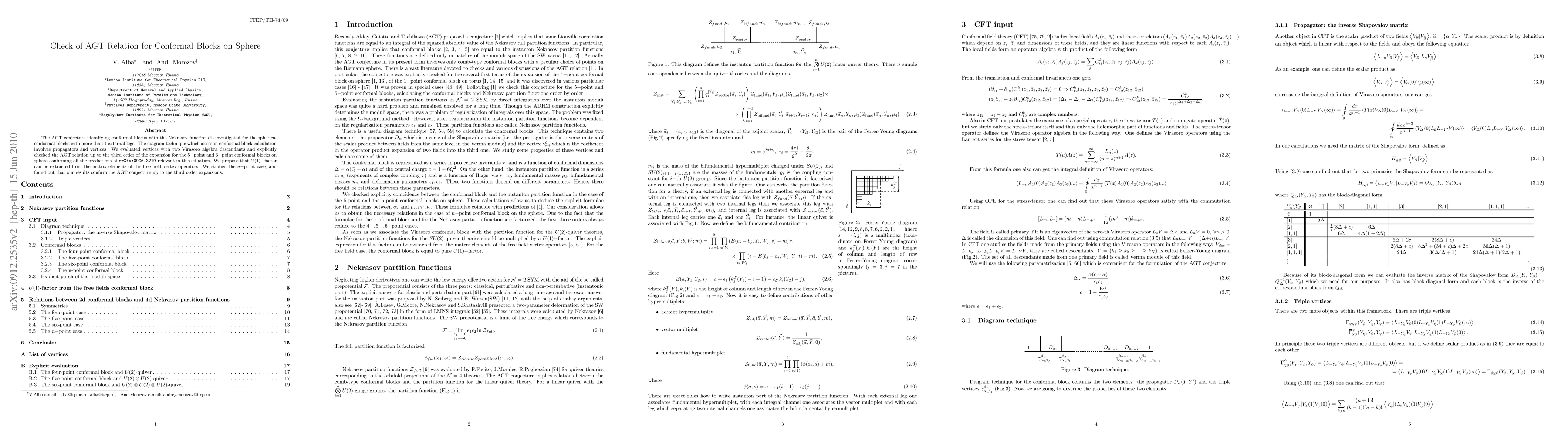 The AGT conjecture identifying conformal blocks with the Nekrasov functions is investigated for the spherical conformal blocks with more than 4 external legs. The diagram technique which arises in conformal block calculation involves propagators and vertices. We evaluated vertices with two Virasoro algebra descendants and explicitly checked the AGT relation up to the third order of the expansion for the 5-point and 6-point conformal blocks on sphere confirming all the predictions of arXiv:0906.3219 relevant in this situation. We propose that U(1)-factor can be extracted from the matrix elements of the free field Vertex operators. We studied the n-point case, and found out that our results confirm the AGT conjecture up to the third order expansions.
